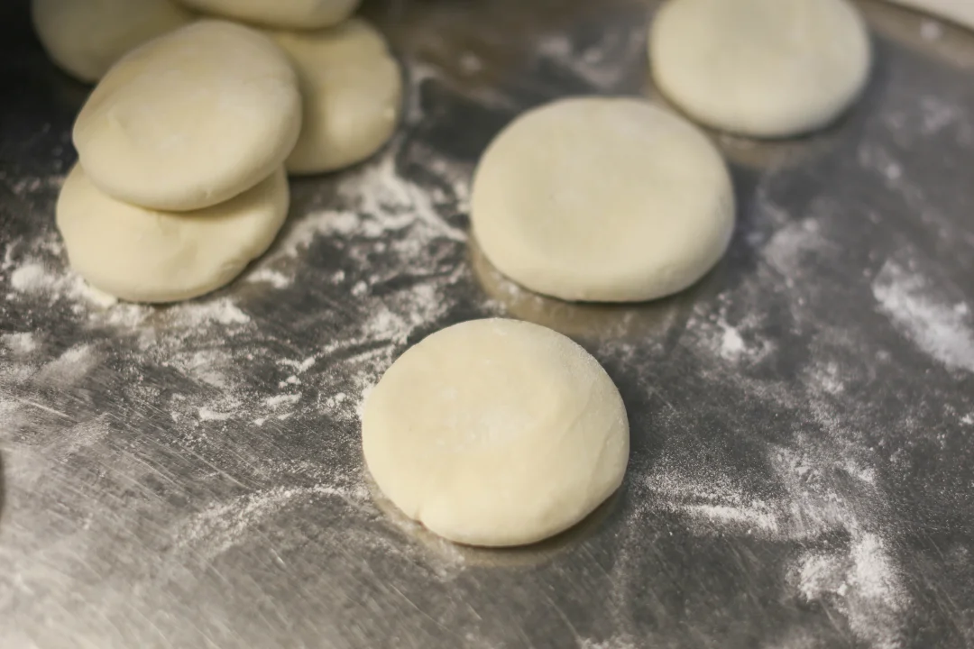 时间到了之后,揉面排气,大约揉8-10分钟不间断揉,面团中间没有小孔为准,分成大小一样的剂子,擀成中间厚四边薄的片状,放馅包褶子。