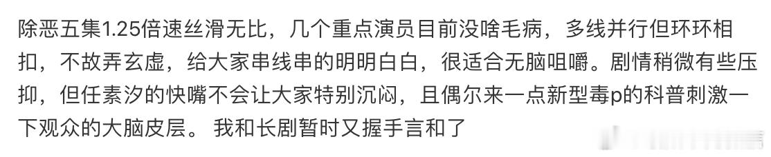 和长剧暂时又握手言和了如今很多长剧又水又拖沓,《除恶》却全程干货,节奏利落不磨叽