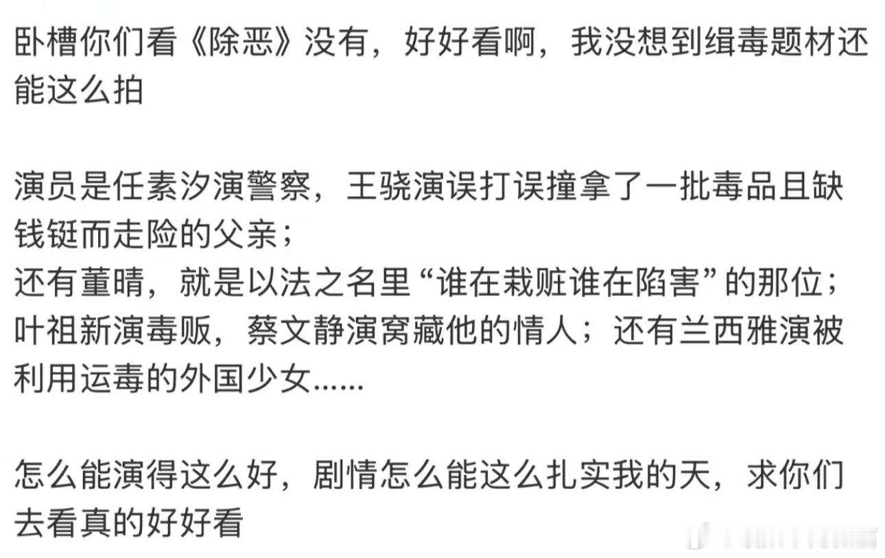 和长剧暂时又握手言和了如今很多长剧又水又拖沓,《除恶》却全程干货,节奏利落不磨叽,一开场就抓住眼球,让人看得根本停不下来!