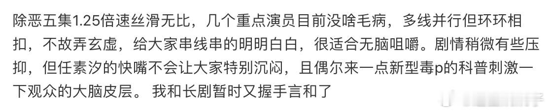 和长剧暂时又握手言和了《除恶》全程没有多余铺垫,不搞悬浮套路,每一段剧情都扎实走心,制作诚意满满,剧荒很久终于挖到一部能安心追下去的好剧!