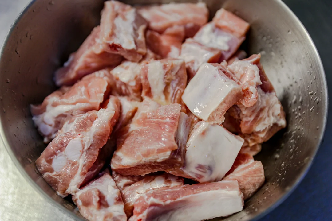 1️⃣:猪小排泡清水30分钟后沥干水分,加入盐、糖、花雕酒腌制2个小时以上,确保咸味融入肉里面。