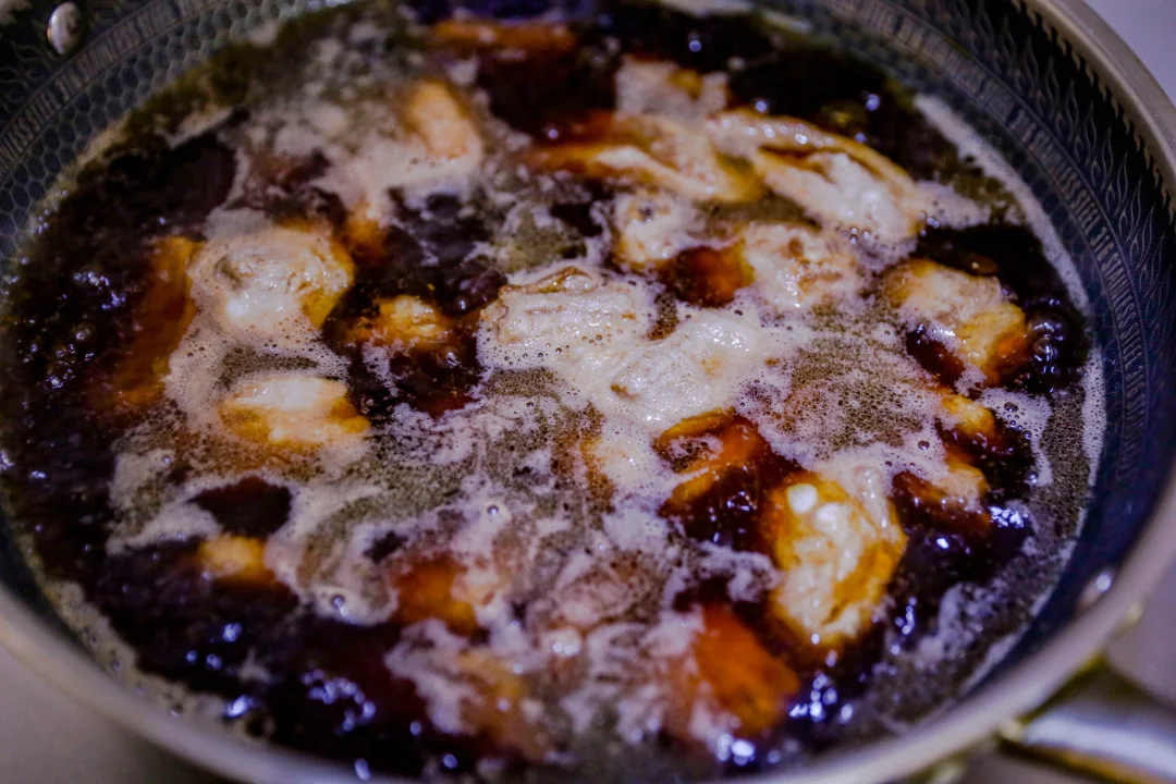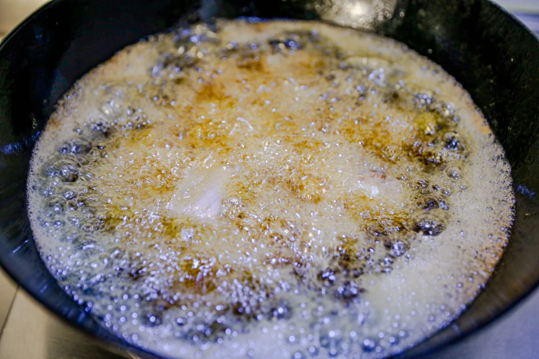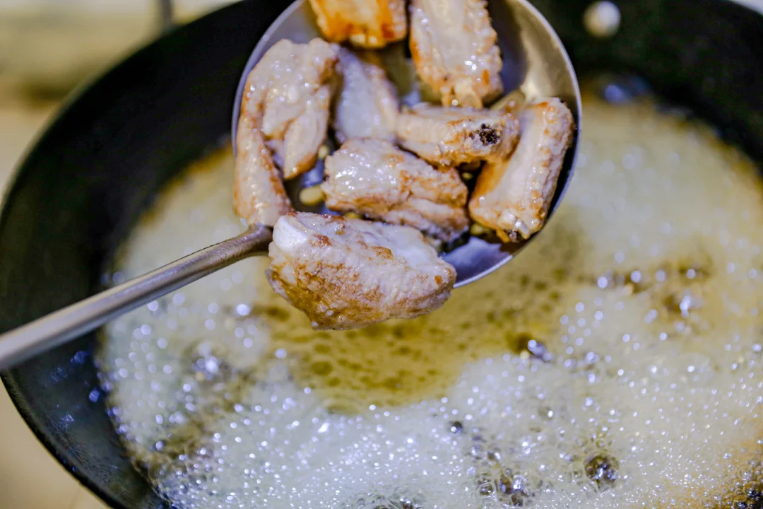 2️⃣:烧油把腌制好的排骨炸至红棕色。