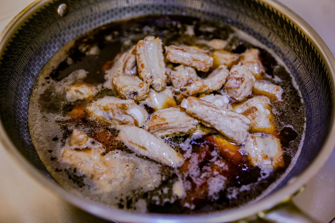 3️⃣:清水+酱油+冰糖+米醋(一半的量)+番茄酱+姜片+花雕酒,煮滚后放入炸好的小排骨炖煮40分钟。