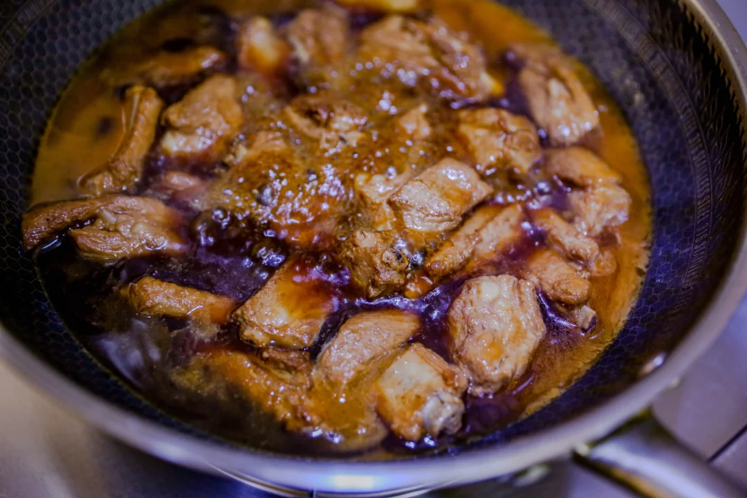 4️⃣:时间到了之后开盖大火收汁,待汤汁浓稠的时候加入柠檬汁和剩余的一半米醋,翻炒均匀即可装盘。