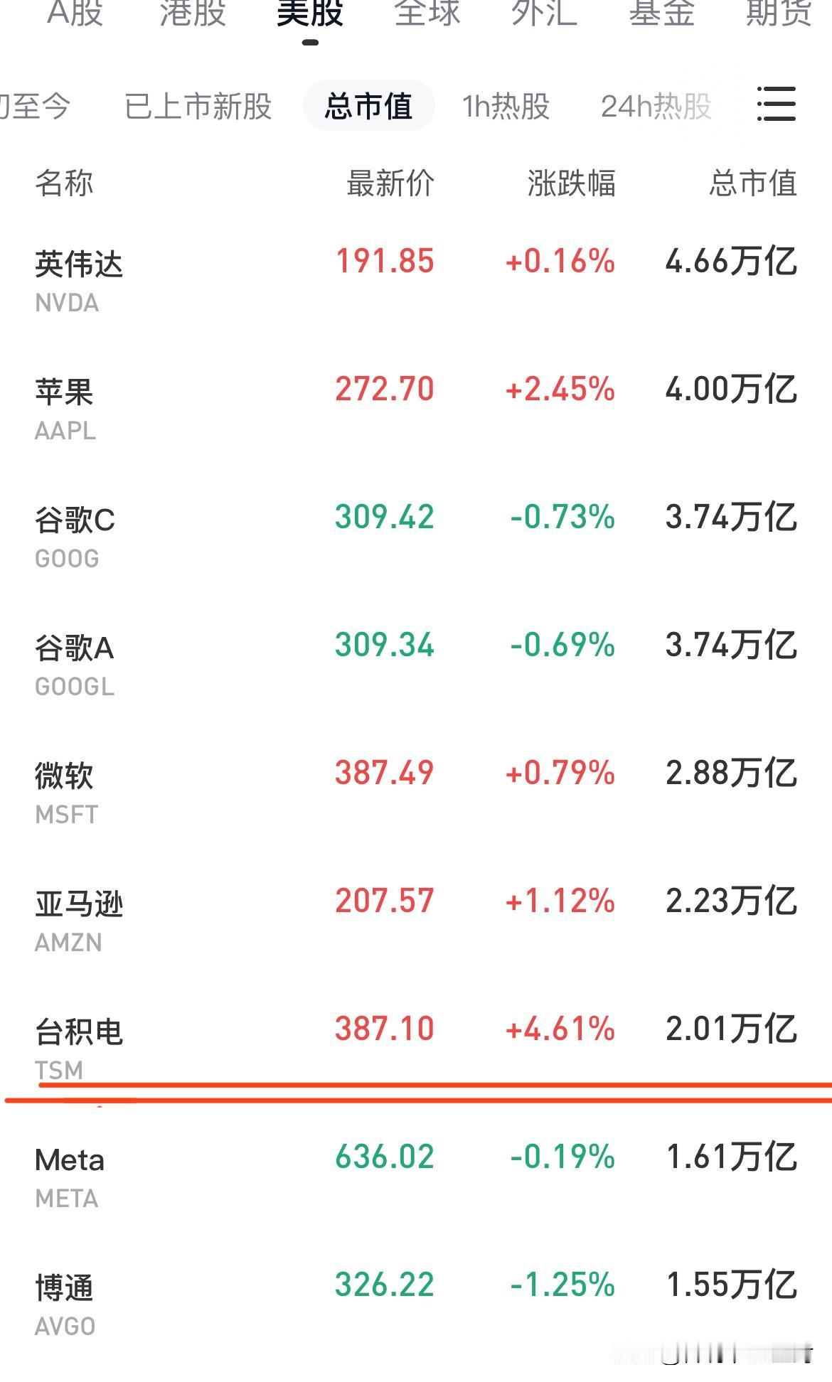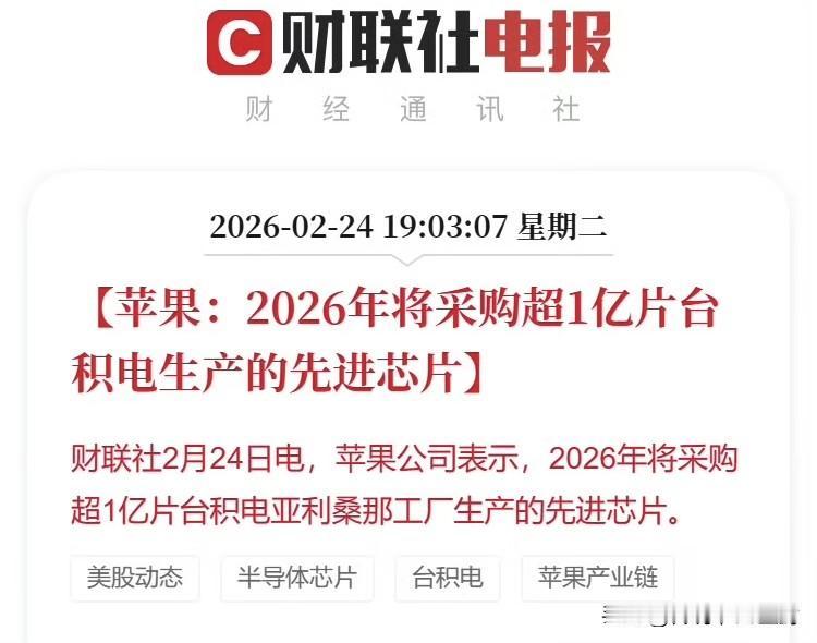 刚刚。 台积电2万亿美元市值了。 全球制造业公司的天花板…… 美股市值榜第六名,距离第五的亚马逊也仅有约10%的差距。 为什么台积电最近几年一路高歌猛进? 看看今天最新的新闻就知道了: 苹果2026年将采购超1亿片台积电亚利桑那工厂生产的先进芯片(图三)。 其实也不仅仅是苹果了,几乎所有的科技企业都离不台积电的芯片,美股市值榜的几个巨头,恰恰是台积电最大的几个客户。 这就是台积电的价值所在,越是厉害的科技企业,越是离不开台积电…… 科技的基座、AI的“铲子”。 更重要的是,现在依然是处于AI的萌芽期,未来AI的需求越旺盛,台积电的地位可能也就越稳固……