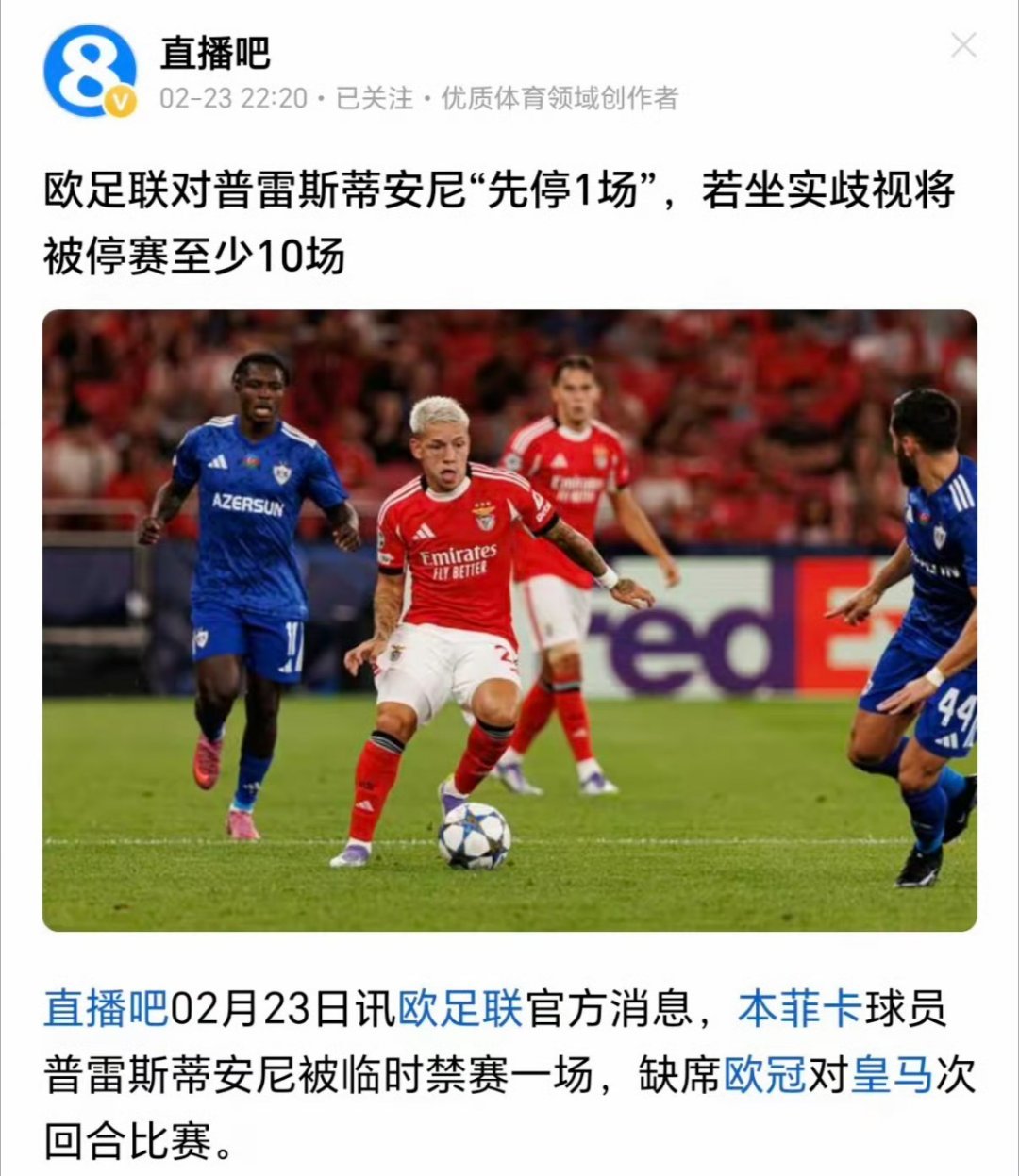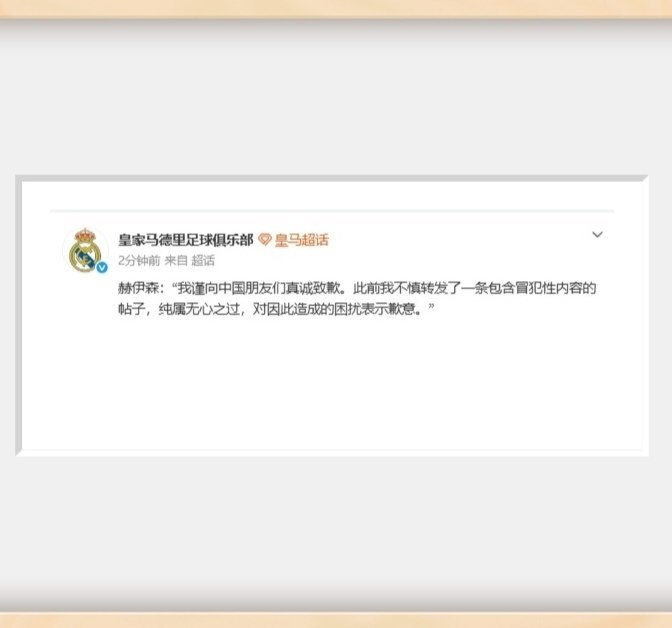 皇马vs本菲卡赫伊森道歉普雷斯蒂安尼被临时禁赛皇马主场对本菲卡(欧冠附加赛):欧足联官方宣布,本菲卡球员普雷斯蒂安尼因涉嫌种族歧视被停赛一场。皇家马德里球员赫伊森在个人社交媒体上转发一段视频动态,其中包含对华人种族歧视内容(他在舆论发酵后删除了视频)。赫伊森的行为未被处罚。