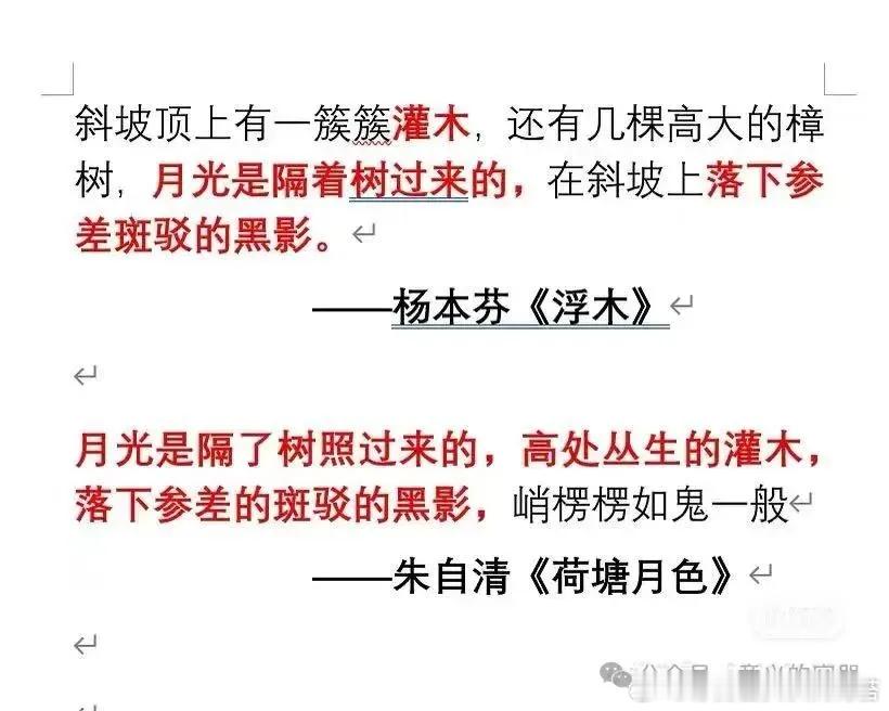 朱自清的《荷塘月色》已成国民记忆:“月光是隔了树照过来的,高处丛生的灌木,落下参差的斑驳的黑影。”到了杨本芬的《浮木》里,就成了“月光是隔着树过来的,在斜坡上落下参差斑驳的黑影”。