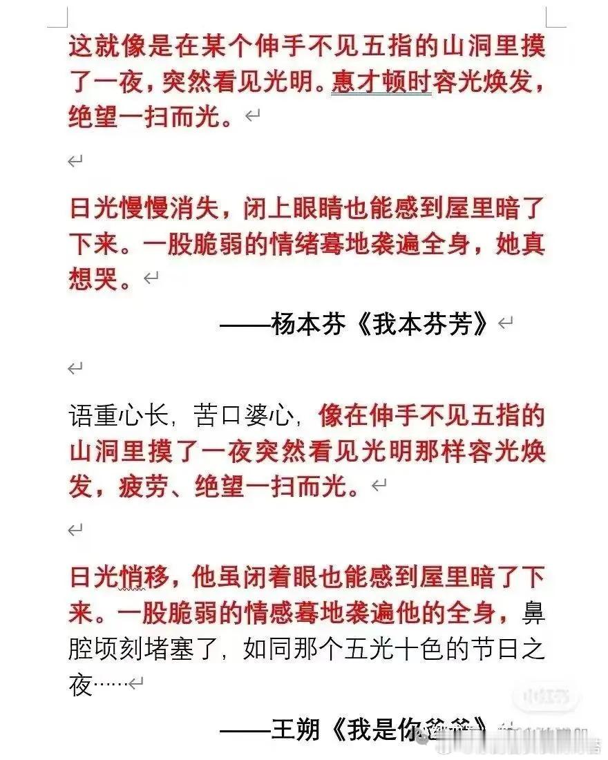 王朔写“像在伸手不见五指的山洞里摸了一夜突然看见光明”,她就在《我本芬芳》里写“就像是在某个伸手不见五指的山洞里摸了一夜,突然看见光明”。