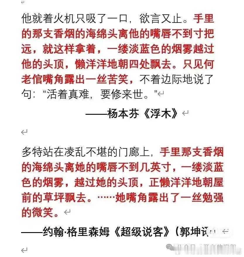 约翰·格里森姆笔下“一缕淡蓝色的烟雾,越过她的头顶,懒洋洋地朝屋前的草坪飘去”,到了她的《浮木》里,就成了“一楼淡蓝色的烟雾越过他的头顶,懒洋洋地朝四处飘去”。