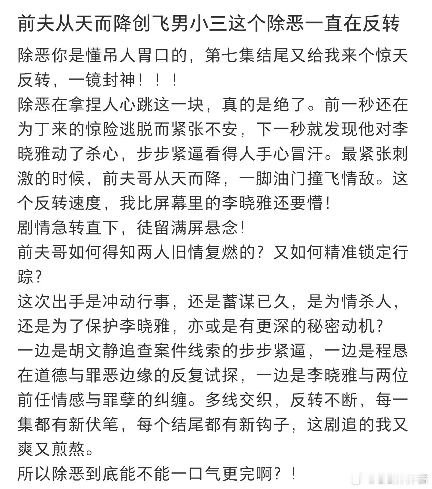 可以用这些词来评价除恶无人能独善其身,立意太深刻没有主角光环,真实到让人窒息剧情紧凑又刺激每一集都有新的钩子呀 🎣