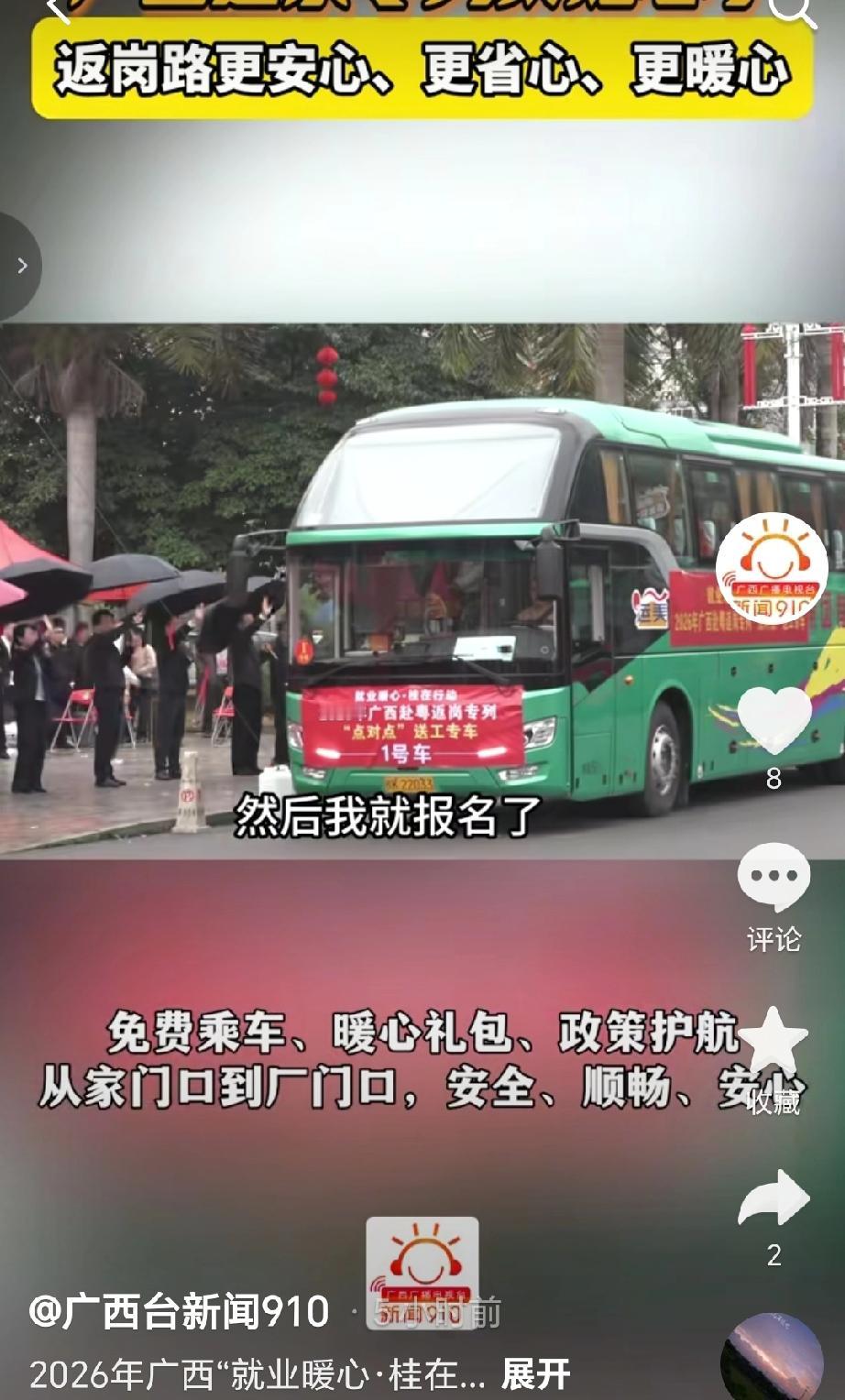 2月24日,2026年广西“就业暖心·桂在行动”赴粤返岗专列“点对点”送工活动在玉林市兴业县启动,南宁、贵港、桂林、来宾等地同步开出多趟专列,全区近1300名务工人员免费搭乘前往广州、深圳等地 。活动由粤桂两省区人社部门携手国铁南宁局开展,费用全由政府承担,采用“专车接驳+动车专列”模式,还为务工人员发放暖心包、开展政策宣讲,铁路部门也开辟绿色通道、提供专属候车区等暖心服务 。此次活动重点保障脱贫人口、就业困难人员等群体,2月26日柳州还将开行赴粤专列运送500名务工人员 。今年一季度,广西计划开行专车专列3000车次以上、服务超10万人次,同时举办超1500场专场招聘会、发布不少于60万个就业岗位 。(来源于@广西台新闻910)