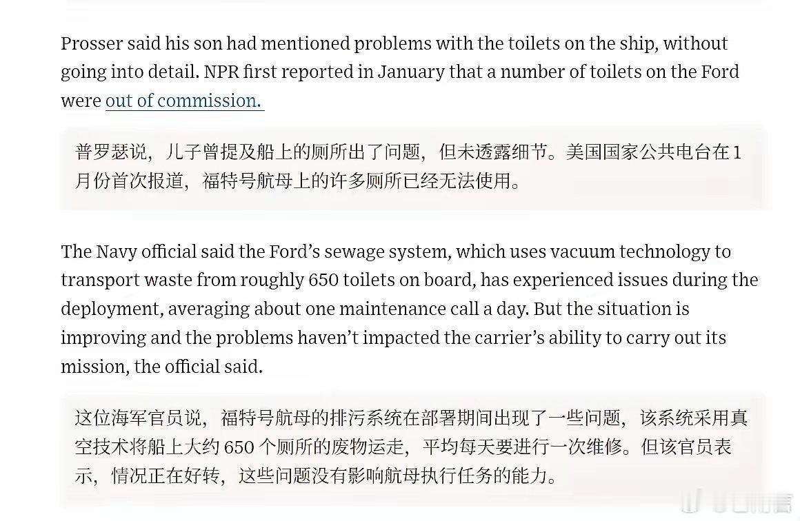 美福特号航母厕所大面积瘫痪美国“印度化”趋势越来越明显了,福特号在中东遇到大麻烦,这艘全世界最大的航母竟然有五百多个厕所无法使用,不得不靠港维护,实在是过于离谱!上一次航母被“粪水”冲击的新闻是印度维克兰特号,上上一次是布什号厕所故障导致不少美国士兵泌尿感染,航母看起来很强大,有时候却被小小的厕所问题导致战斗力大减!