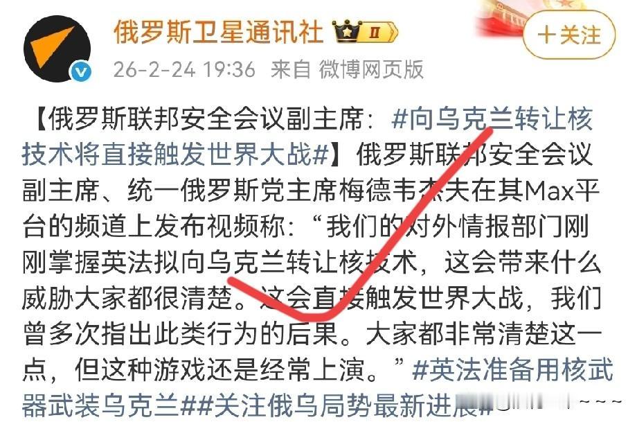 就在刚刚, 梅德韦杰夫说:向乌克兰转让核技术将直接触发世界大战。 现在的情况是英国和法国非常想让乌克兰拥有核武器,非常不想让乌克兰输掉这场战争。乌克兰呢?如果英国和法国提供核技术,他能不想要吗?肯定想要啊。 所以,梅德韦杰夫必须得站出来说话以对此作出回应,否则真转让了,乌克兰拥有了核武器就来不及了。难道俄乌战争最后真的演变成一场核战才结束吗?