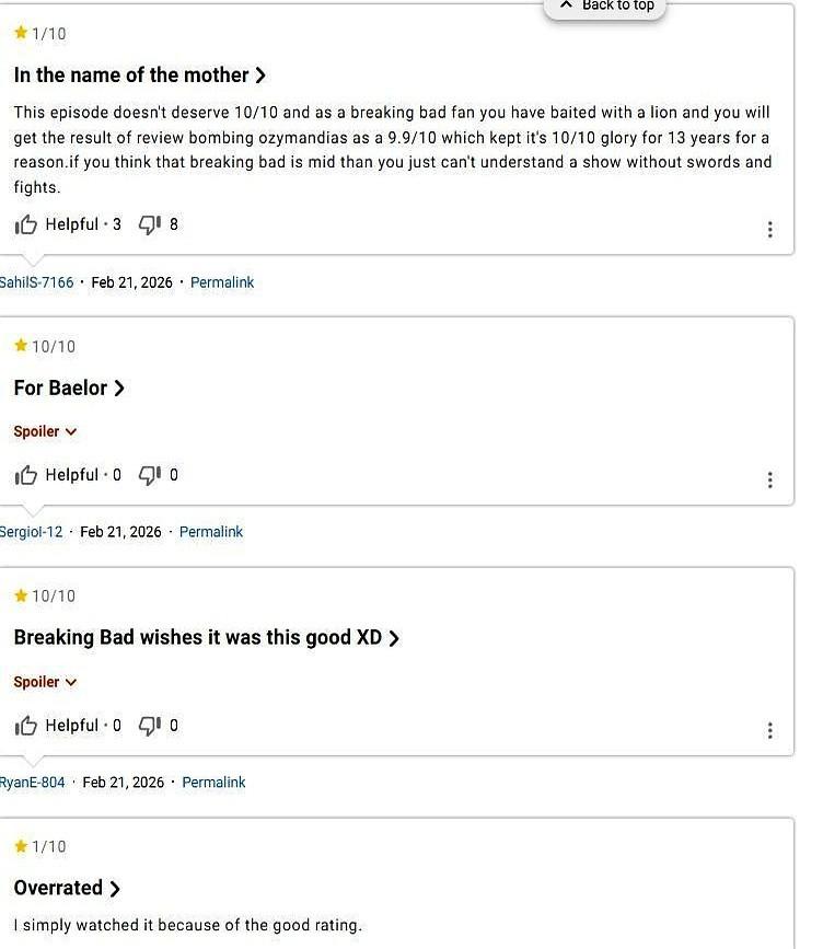 谁能想到,霸榜IMDb近13年的神剧《绝命毒师》,那个唯一的满分10.0单集,说没就没了。 导火索是《权游》新衍生剧《七王国的骑士》第五集播出后,评分一度冲到9.9,直接威胁到了《绝命毒师》的王座。 毒师老粉护主心切,抱团涌入新剧页面狂刷1分。权游粉哪能受这气,反手就把那集封神13年的《Ozymandias》从10.0拉到9.9,直接干出榜首,掉到第九。 一场大战,两败俱伤,谁也没赢。这压根不是作品好坏之争,纯粹是粉丝在宣泄情绪,捍卫自己的文化归属。 你打的不是分,是归属感。