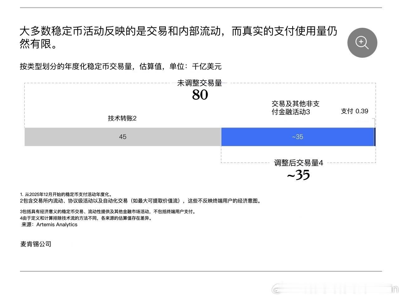 麦肯锡研究:稳定币因其有望实现更快、更便宜且可编程的支付而备受关注,据报道其年交易量高达 35 万亿美元。然而,这些交易活动大多并非真正的终端用户支付,例如向供应商付款或汇款。它们主要包括交易、内部资金转移和自动化区块链活动。