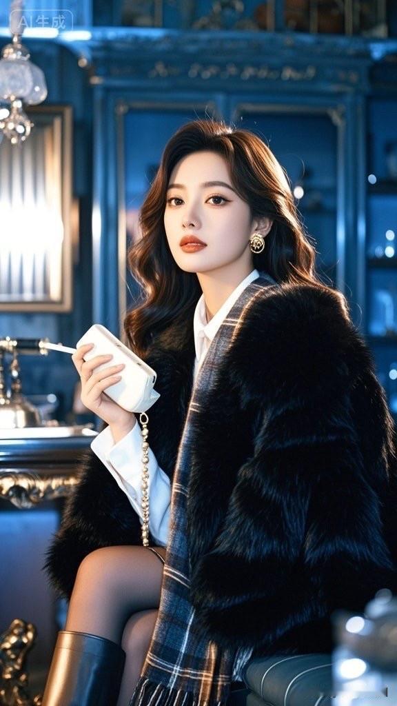 深灰高领是秋冬的底色棕色皮带勾勒出岁月的轮廓。展开的格纹披肩如同打开一本旧相