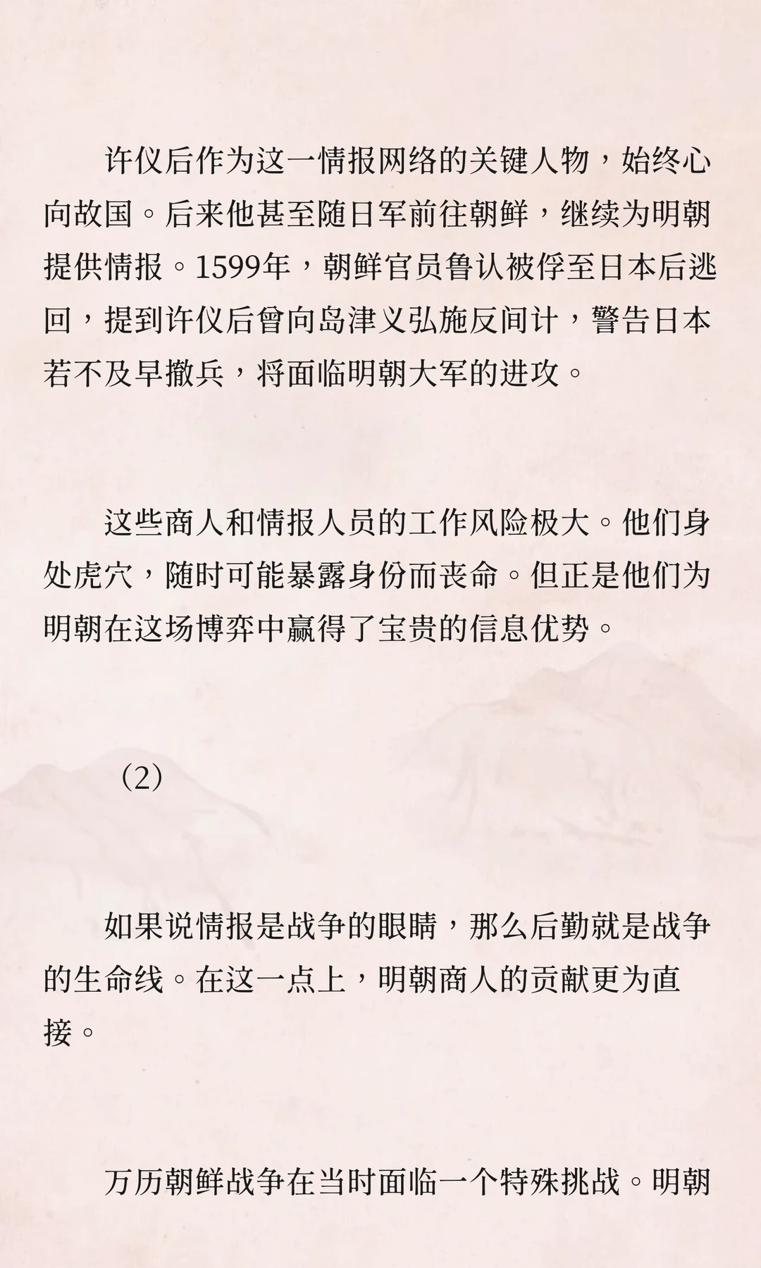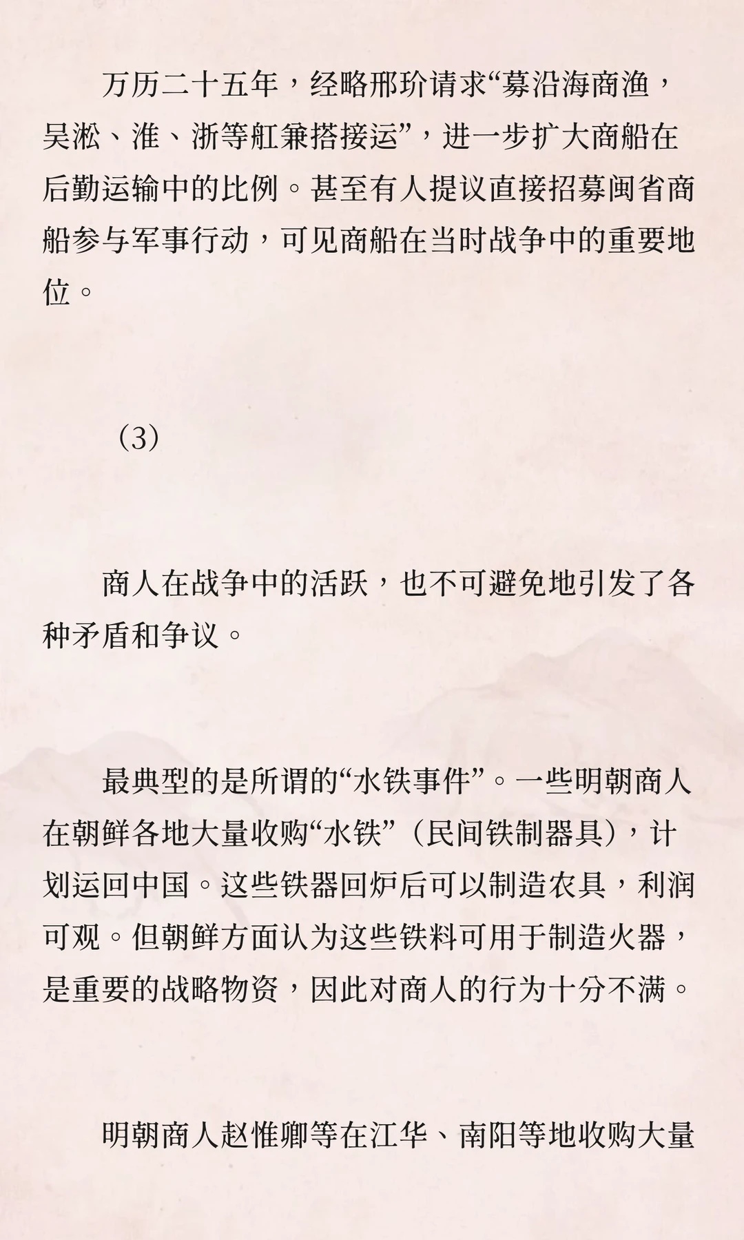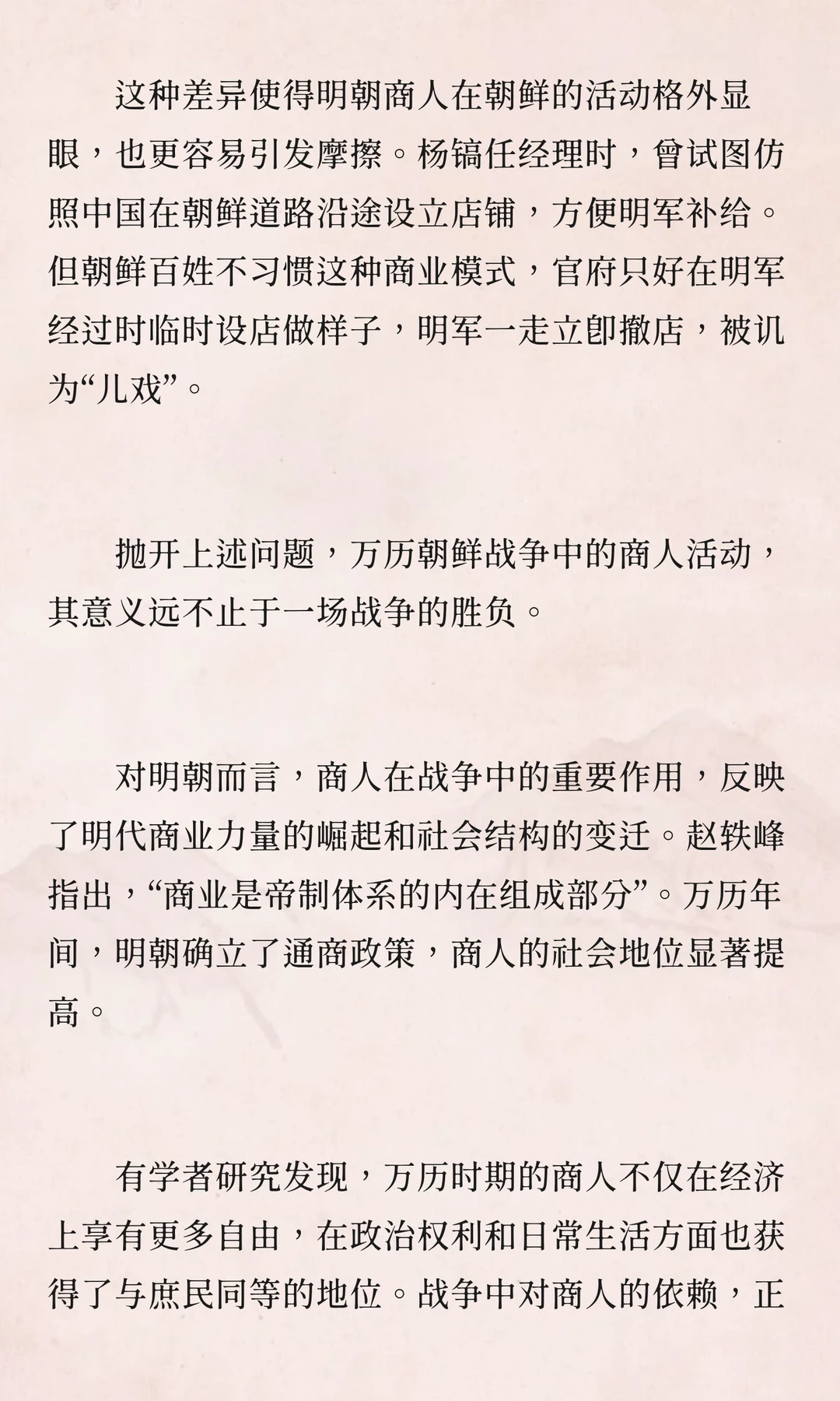 明朝商人在万历朝鲜战争中发挥了关键作用,通过情报传递、物资补给和后勤保障,为明朝赢得战争提供了重要支持。商人的活跃不仅反映了明代商业力量的崛起,还促进了朝鲜商业的发展,改变了两国的经济格局。