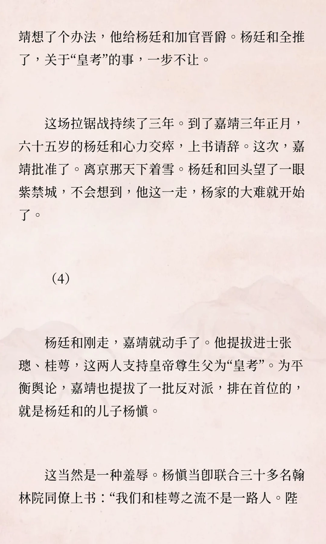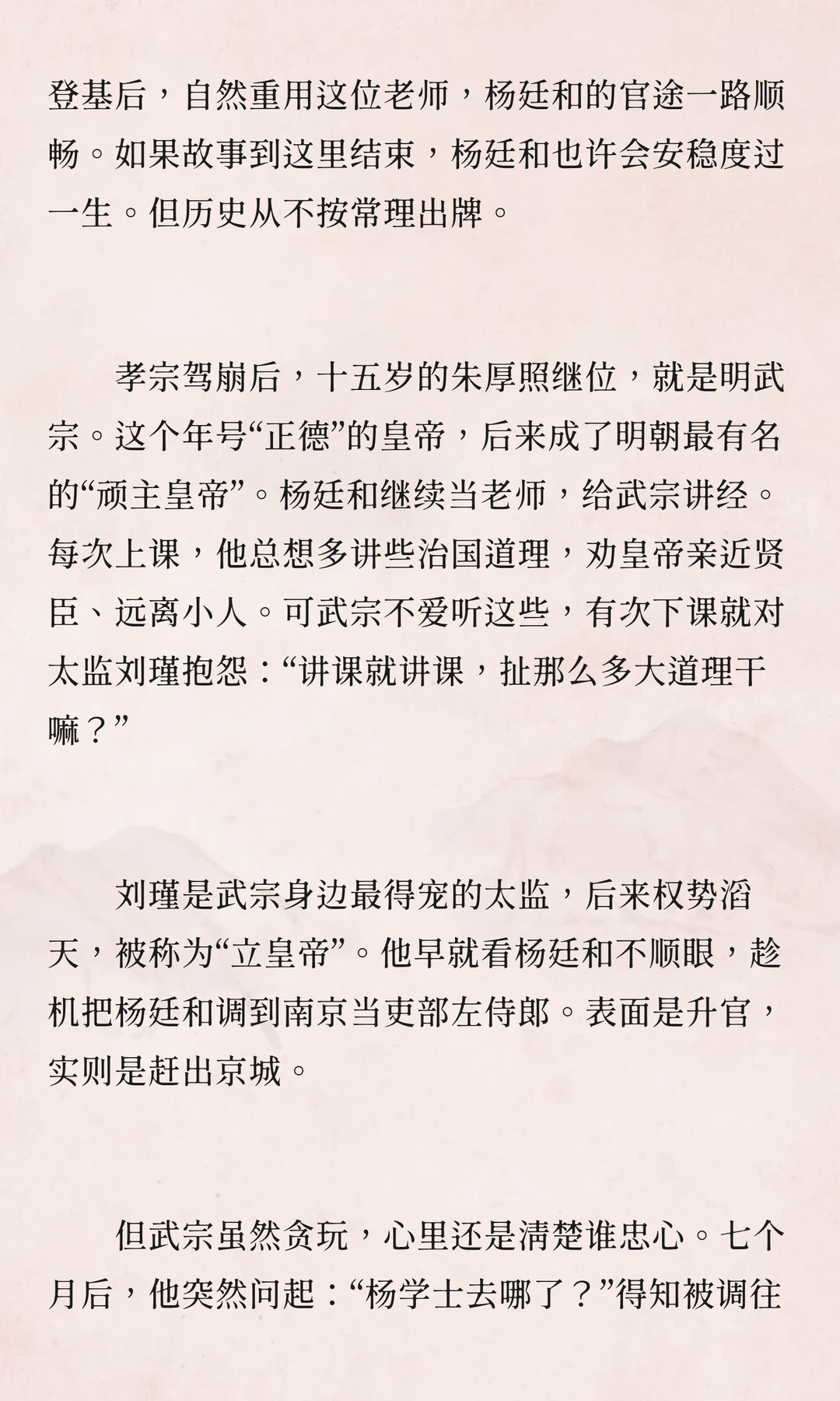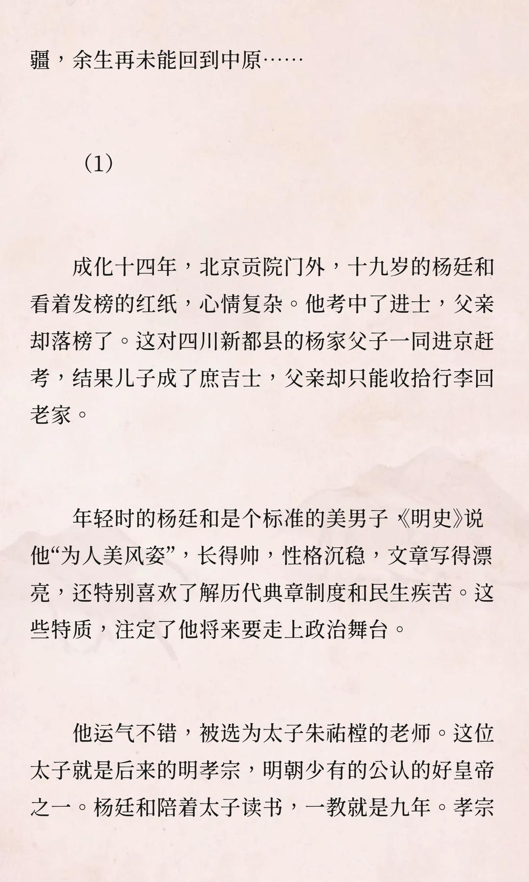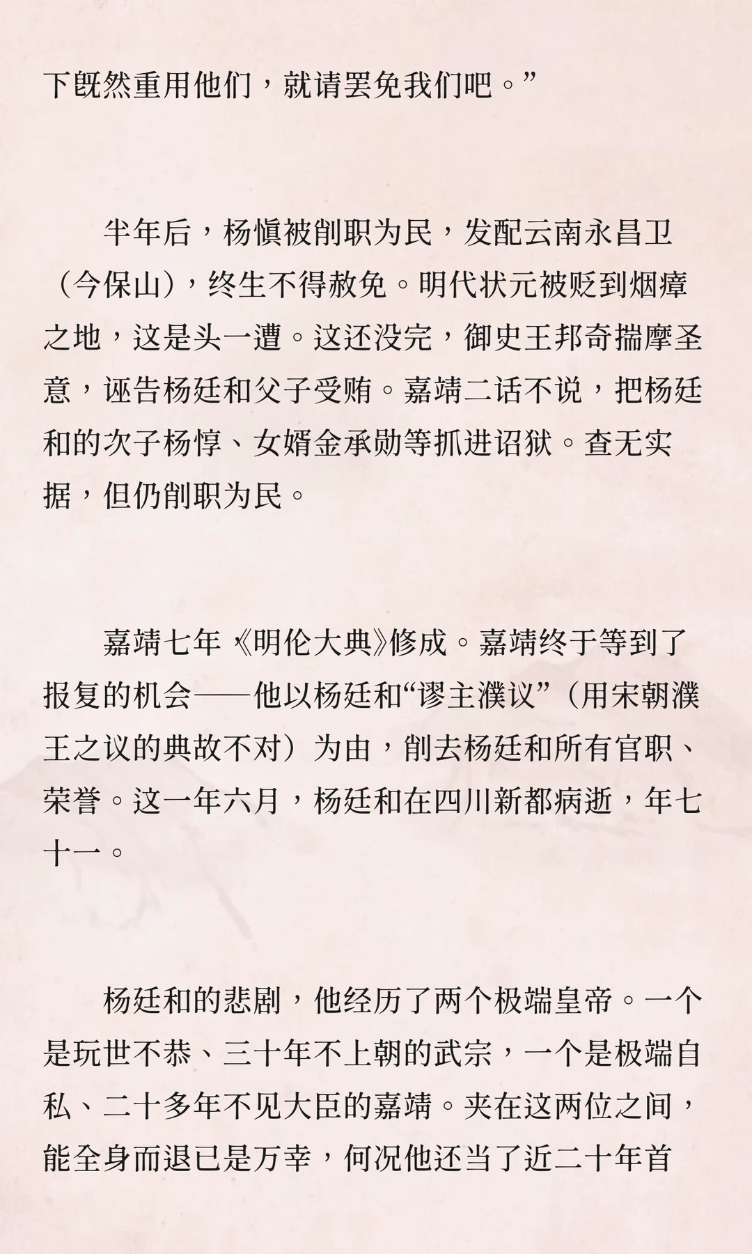 杨廷和,明朝内阁首辅,辅佐武宗、嘉靖两朝,力挽狂澜。晚年因“大礼议”被削职,次子杨慎被发配云南。杨廷和的一生,见证了明朝从盛到衰。