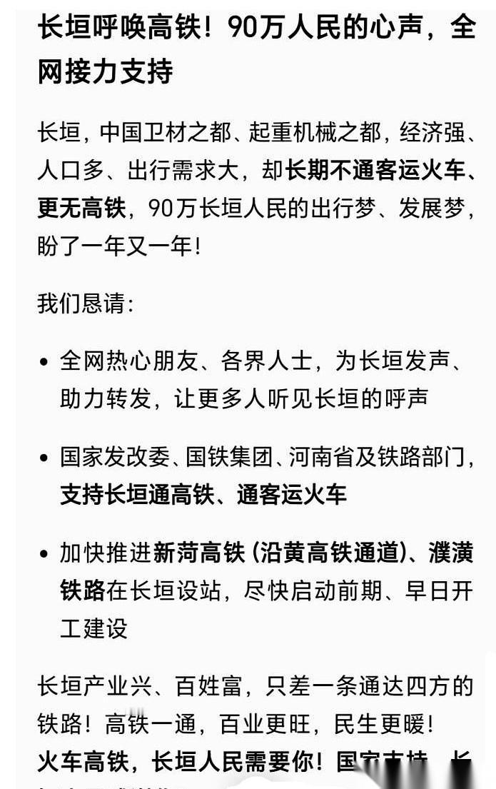 一个90万人口的县城,长垣。 地图上,几条高铁线从它旁边擦身而过,像一条条刻意画出的弧线。 出门办个事,得先坐两小时大巴,跑到隔壁市的车站。学生放假回家,一手拎着行李,一手攥着换乘的大巴票,时间全耗在了路上。 谈生意的人,嘴上说着“马上到”,人还在跨市的高速上堵着。 不方便,三个字,像根刺,扎在每个人心里。 于是,一夜之间,成千上万个屏幕亮了。无数根手指,在出租屋、在写字楼、在工厂车间,敲下了同一句话:“长垣需要高铁”,这五个字像被发射的信号弹,冲上了互联网的天空。 他们没有堵路,也没有拉横幅,只是用这种最安静,也最直接的方式,把一个共同的心声,递了出去。 这不是抱怨,更像是一份90万人的联名“补票”申请。 一个地方的发展,到底是图纸上的直线更重要,还是90万人的奔波更重要?