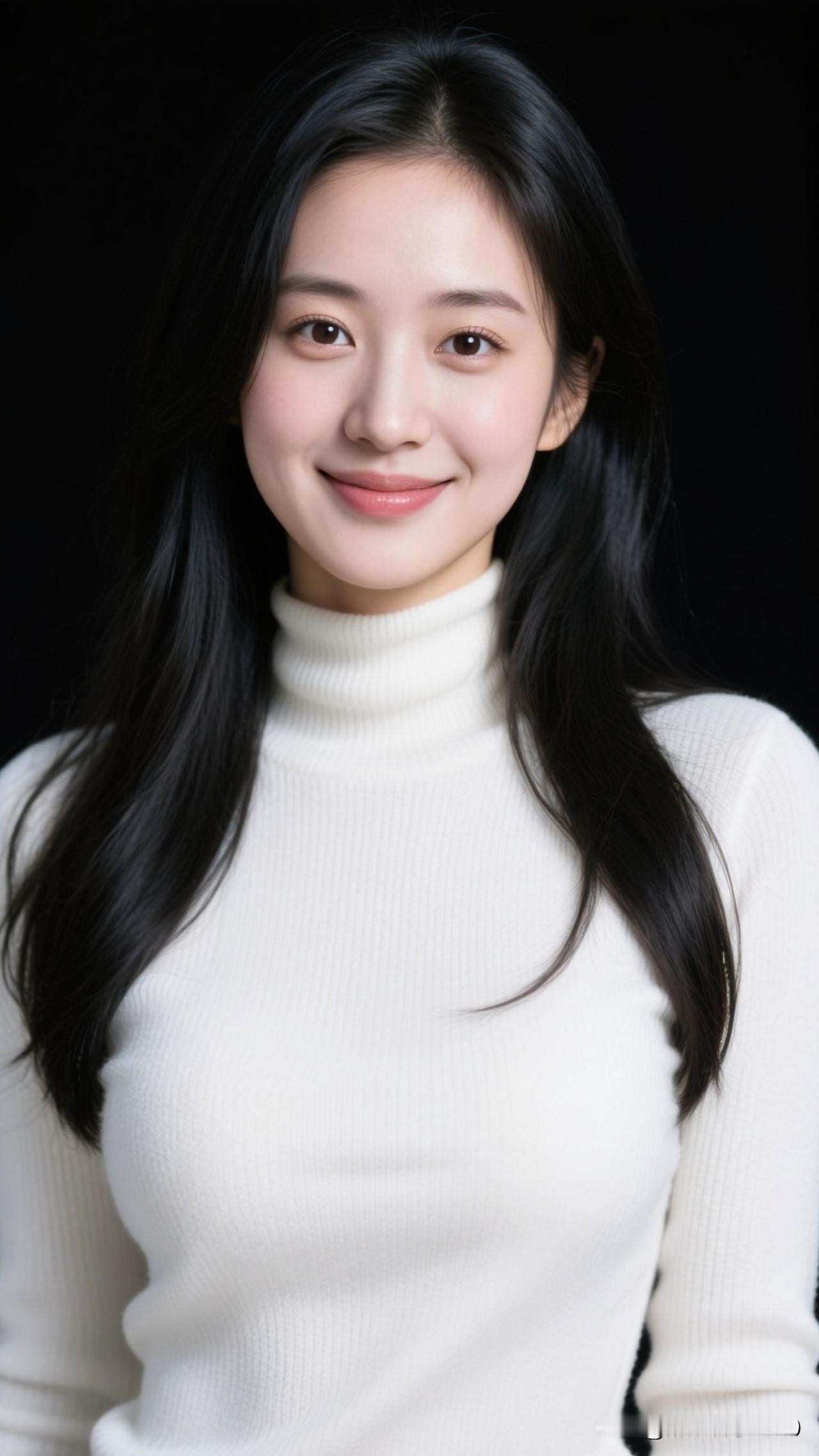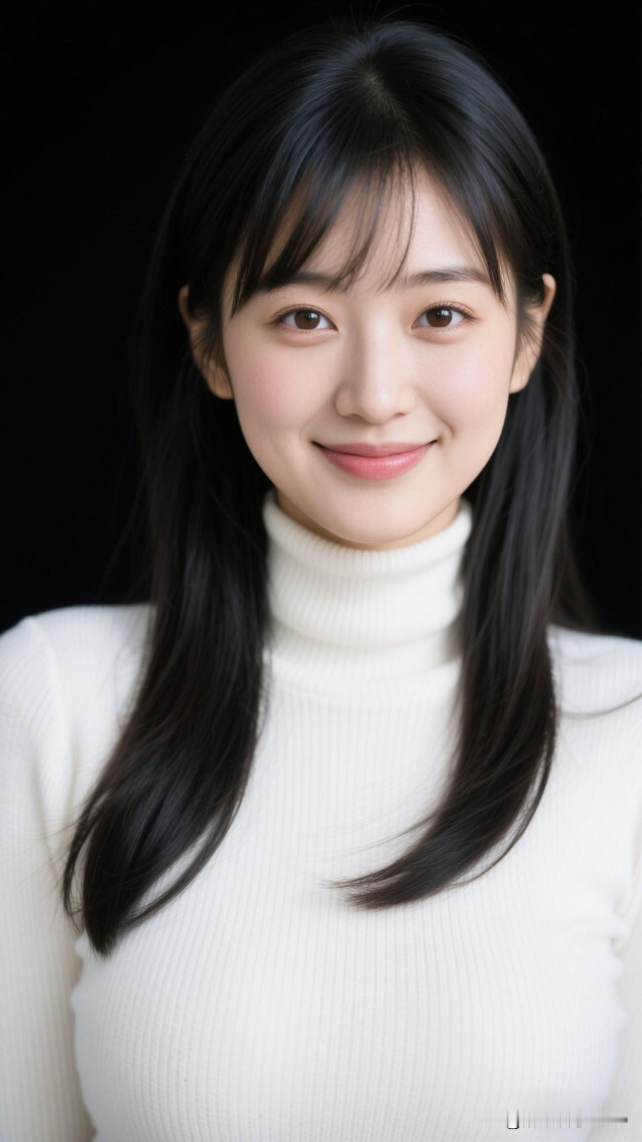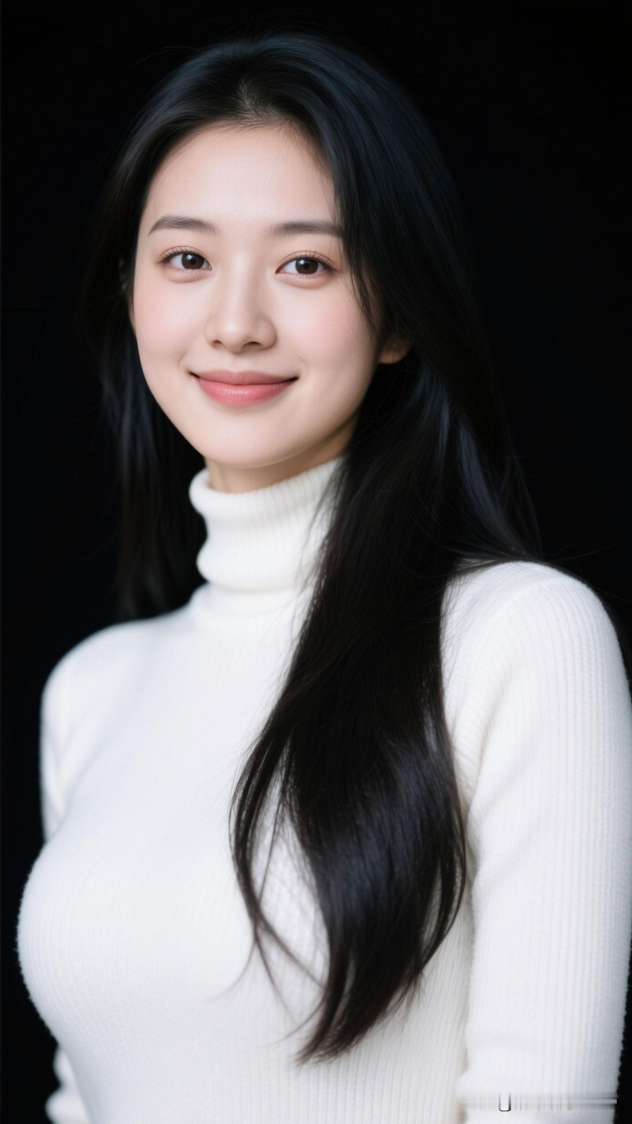 一位东亚女性,她胸形饱满,冷白肤色,有着一头乌黑柔顺的长直发,自然垂落在肩头。她