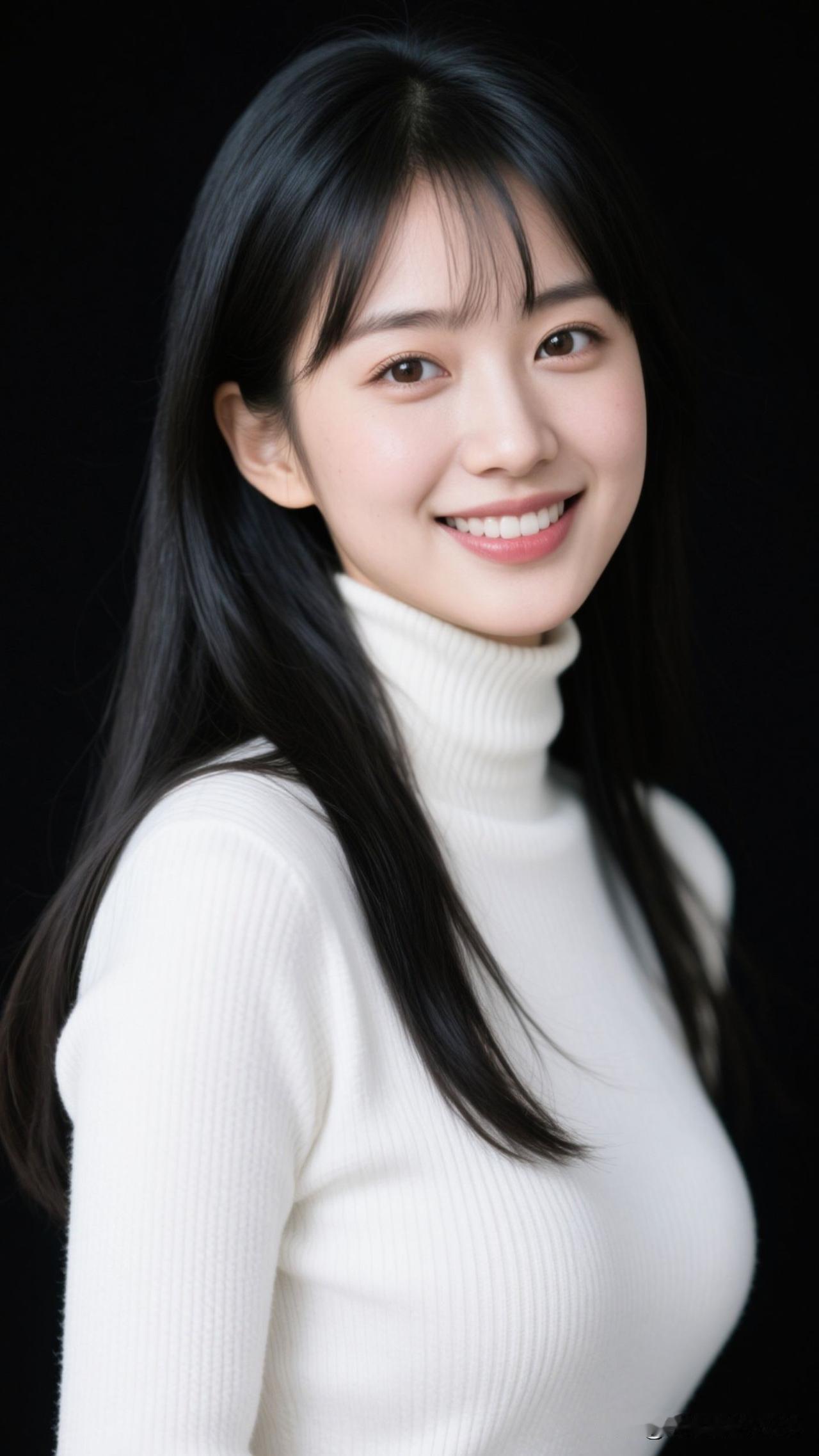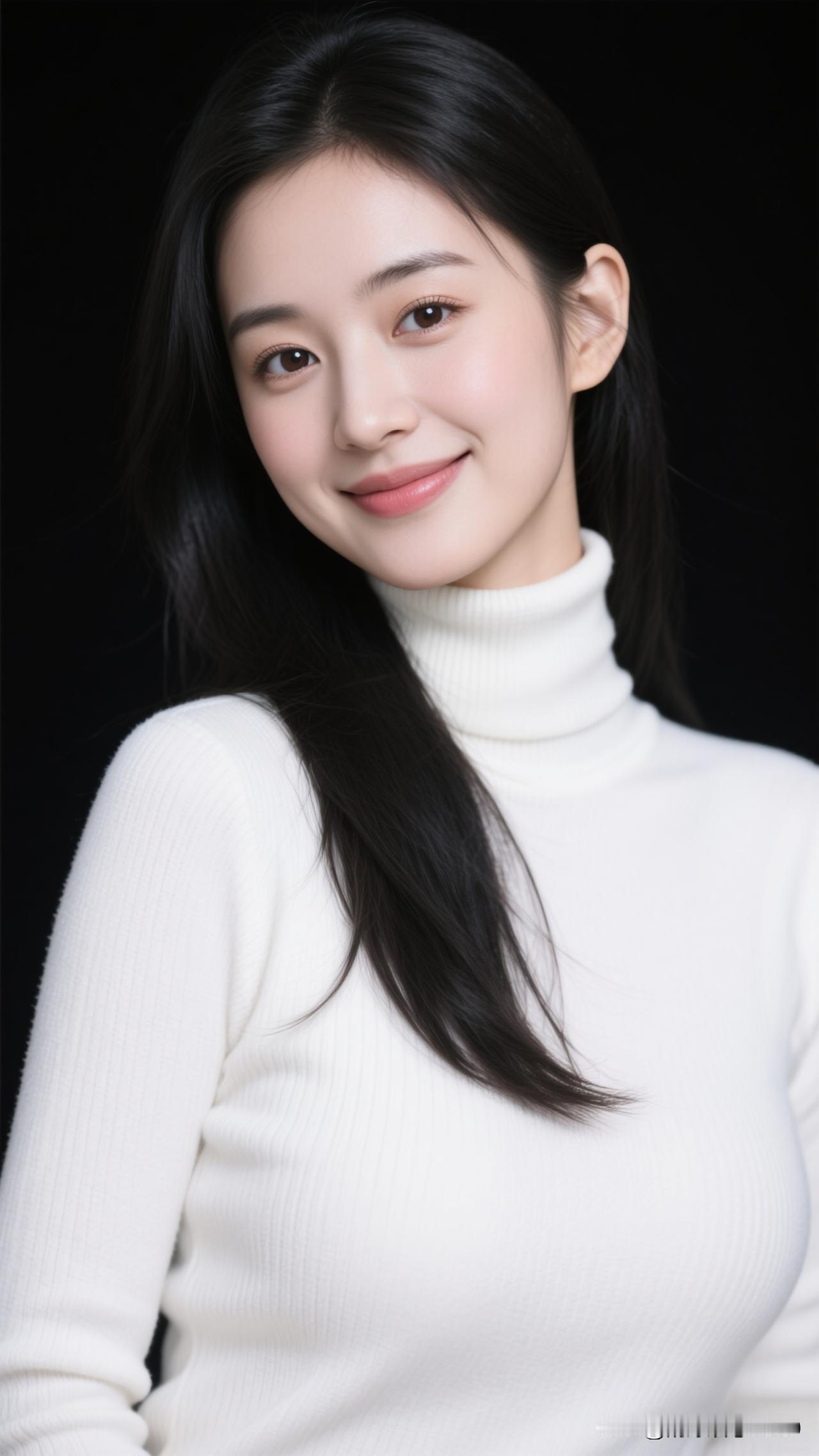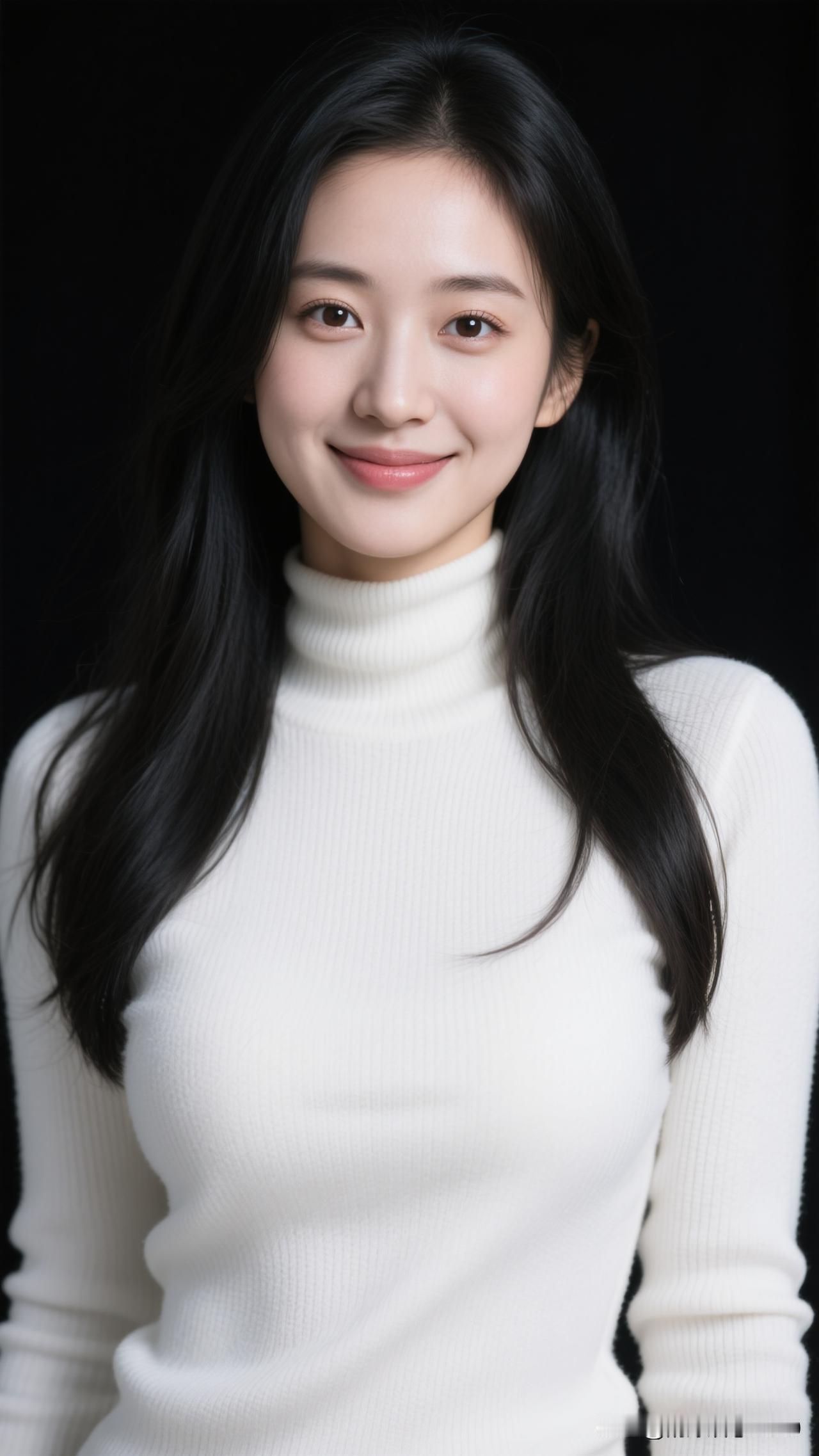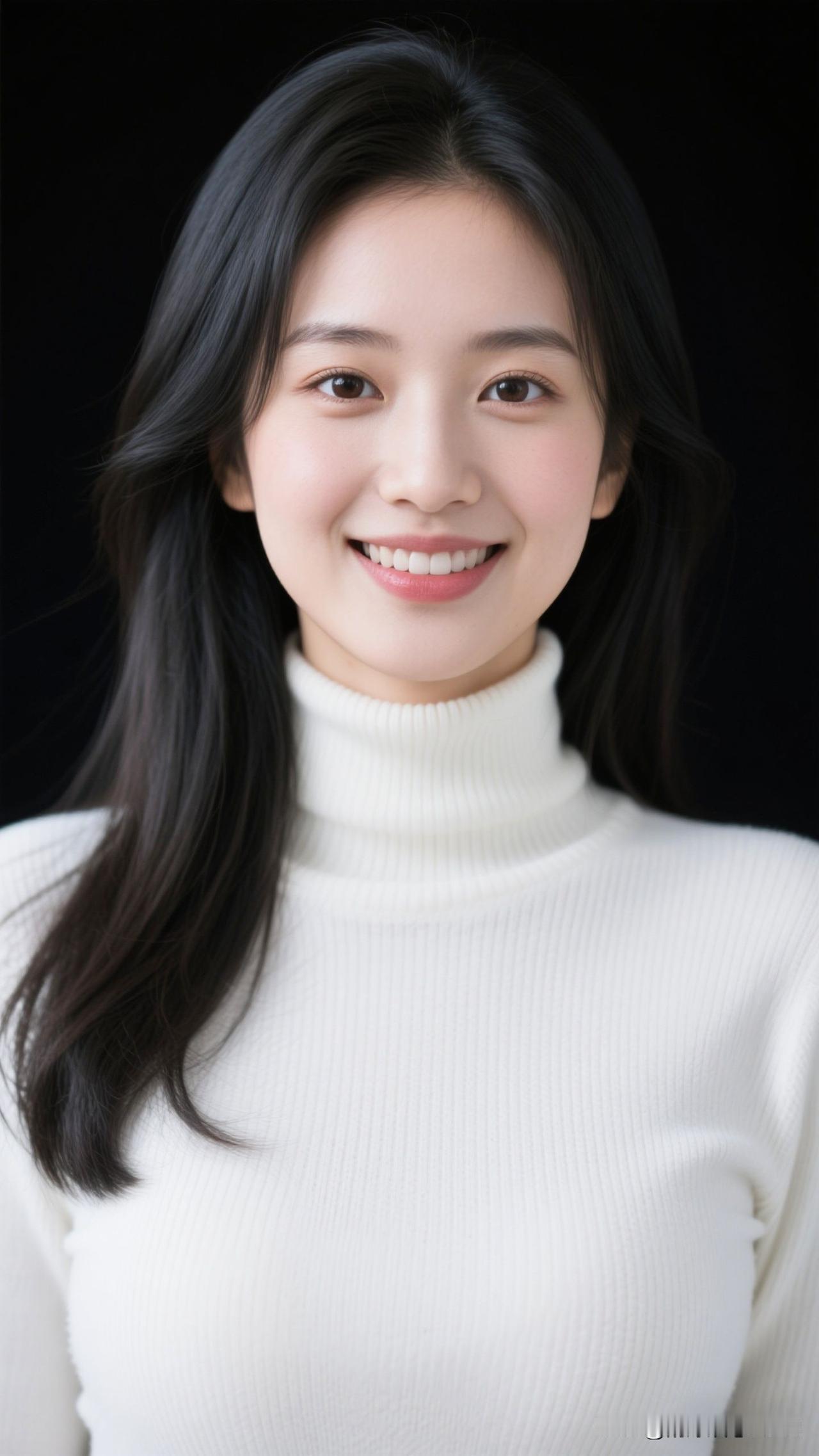一位东亚女性,她胸形饱满,冷白肤色,有着一头乌黑柔顺的长直发,自然垂落在肩头。她