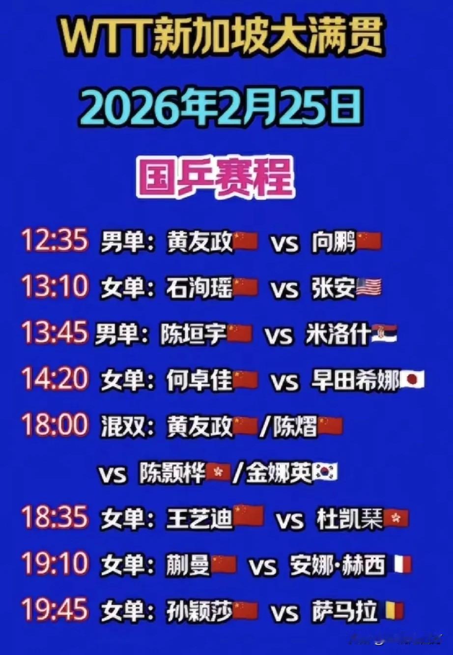 世乒联大满贯赛新加坡站今天将继续进行单打1/16决赛,产生全部16强席位,中国球员黄友政、向鹏、石洵瑶、陈垣宇、何卓佳、王艺迪、蒯曼、孙颖莎以及朱雨玲、林昀儒将陆续登场,昨天的比赛,林诗栋、陈幸同、王曼昱、王楚钦、陈熠已成功晋级16强。
