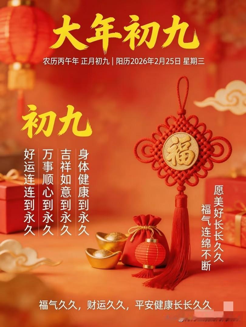 所谓的“九”,是长长久久的爱,也是平平安安的福。人到中年,最懂这平淡日子的珍贵。早安,初九吉祥。[玫瑰][玫瑰] 不求大富大贵,但求一家老小,病灾不侵,长久相伴。新的一天,心怀暖阳,步履从容[福][福] 假期余额虽已不足,但幸福额度正在充值。初九早安,愿工作顺意,生活如意,美好长留[比心][比心] 初九迎天公,登高望远行。2026,愿我们的事业如烈马奔腾,后劲十足!🧧 九九归一,万物向阳。收拾好心情,带上健康和勇气,奔赴下一场山海。早安,打工人![强][强] 长长久久的好运,从今天开始签收。愿你在这个马年,接得住机遇,守得住繁华。[万柿如意][万柿如意] 早安 大年初九,