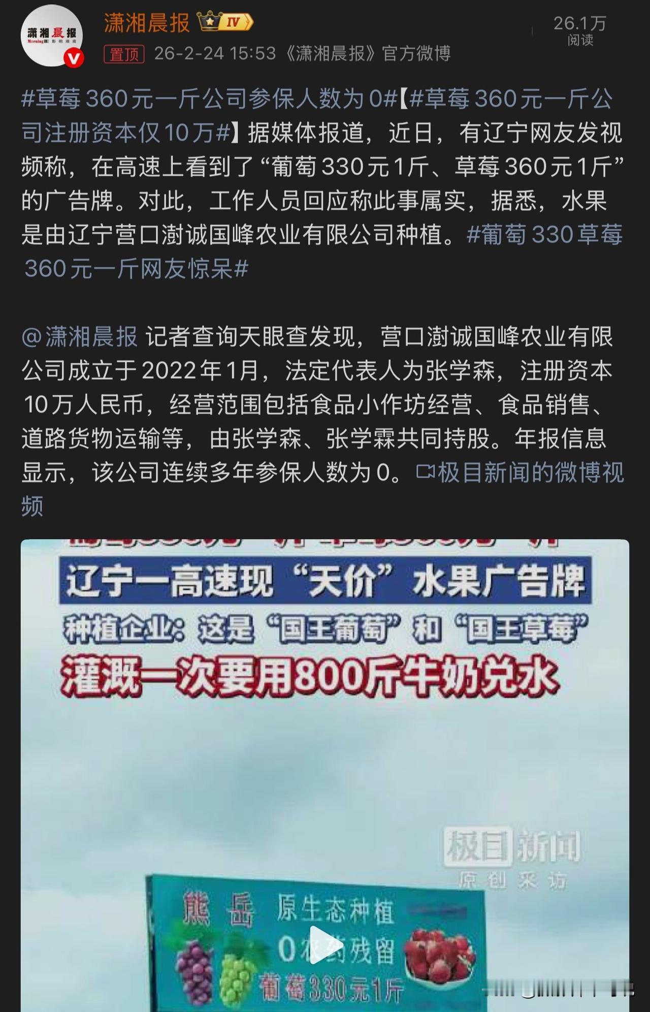三四百一斤的草莓、葡萄等水果吃了怕不是要成仙哦,但为什么给我的感觉是“东西贵不贵全靠故事会”呢?只要故事讲得好一块钱的东西能变成10块钱的!近日,有辽宁网友发视频称,在高速上看到了“葡萄330元1斤、草莓360元1斤”的广告牌,这价格着实有点吓人,莫非又是贫穷限制了我的想象力?记者采访了生产方,据说他家是原生态种植,不打农药,用的都是牛奶和有机肥。产品共有100多项检测报告,无农残!该公司还称,种植草莓的不是一般的土,特意拿黑龙江的非转基因大豆豆饼养土,高台种植也算是全国独家,品种是中国农科院提供的特殊的苗,一颗草莓苗成本就有4元钱,灌溉一次草莓要用800斤牛奶兑水,长出来的草莓又香又甜。好吧,普通人经过这么一翻故事洗礼,感觉360一斤都是占了大便宜!不过,有专家解释说,草莓不能直接吸收牛奶,之所以有奶味儿是品种原因而非浇灌牛奶的原因。想想也对,那如果是咖啡味草莓,按照该公司的逻辑岂不是要浇灌咖啡?有趣的是,据媒体报道,这家看起来就是大公司的草莓生产商,居然连续多年参保人数为0,这意味着这家高大上的公司可能就是家庭作坊,那它是怎么做到通过100多项权威检测的?