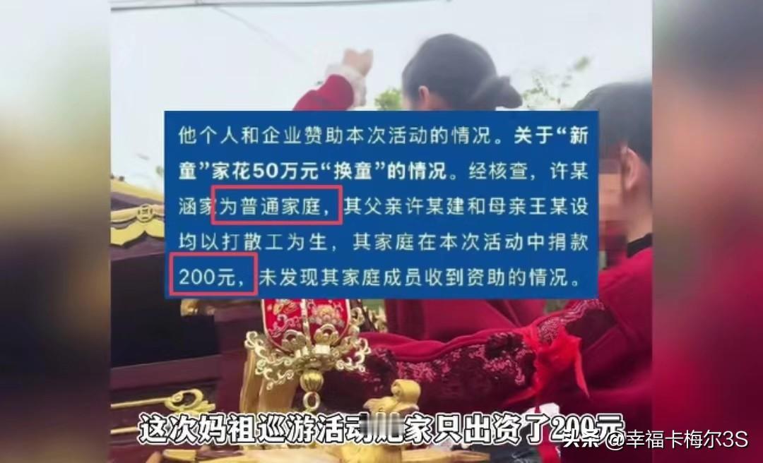 湛江小妈祖换人事件后续:10岁娃穿红衣登轿,官方说全是巧合,你信吗? 起因正月初二那天,湛江东海岛东山镇拾石村搞妈祖巡游,往年连续5年都是17岁的许某蓝当巡游女童,大家都叫她“小妈祖”,很受村民和网友喜欢。 结果今年突然换了人,“小妈祖”还没到现场,一个10岁的小孩就穿着红衣站到轿子上了,直接顶替了她的位置。“小妈祖”到了现场一看,气得直接回家了。后来巡游队伍到她家请她,还吵起来了,这一幕被村民拍下来传到网上,网友们吵翻了天,很多人说这10岁小孩是花钱才登上轿子的。 结果官方通报一出来,大家更懵了。通报说这孩子家里不仅没钱,还挺贫困,这次活动她家就出了200块。她能上轿纯属巧合,是自己去看巡游,突然就想上轿,家人拦不住才让她上去的。更巧的是,她刚好穿了全套红衣服,还拿着红腰带,巡游队伍那么多人又刚好都默许了她登轿。 这一连串的“巧合”,你觉得可信吗?