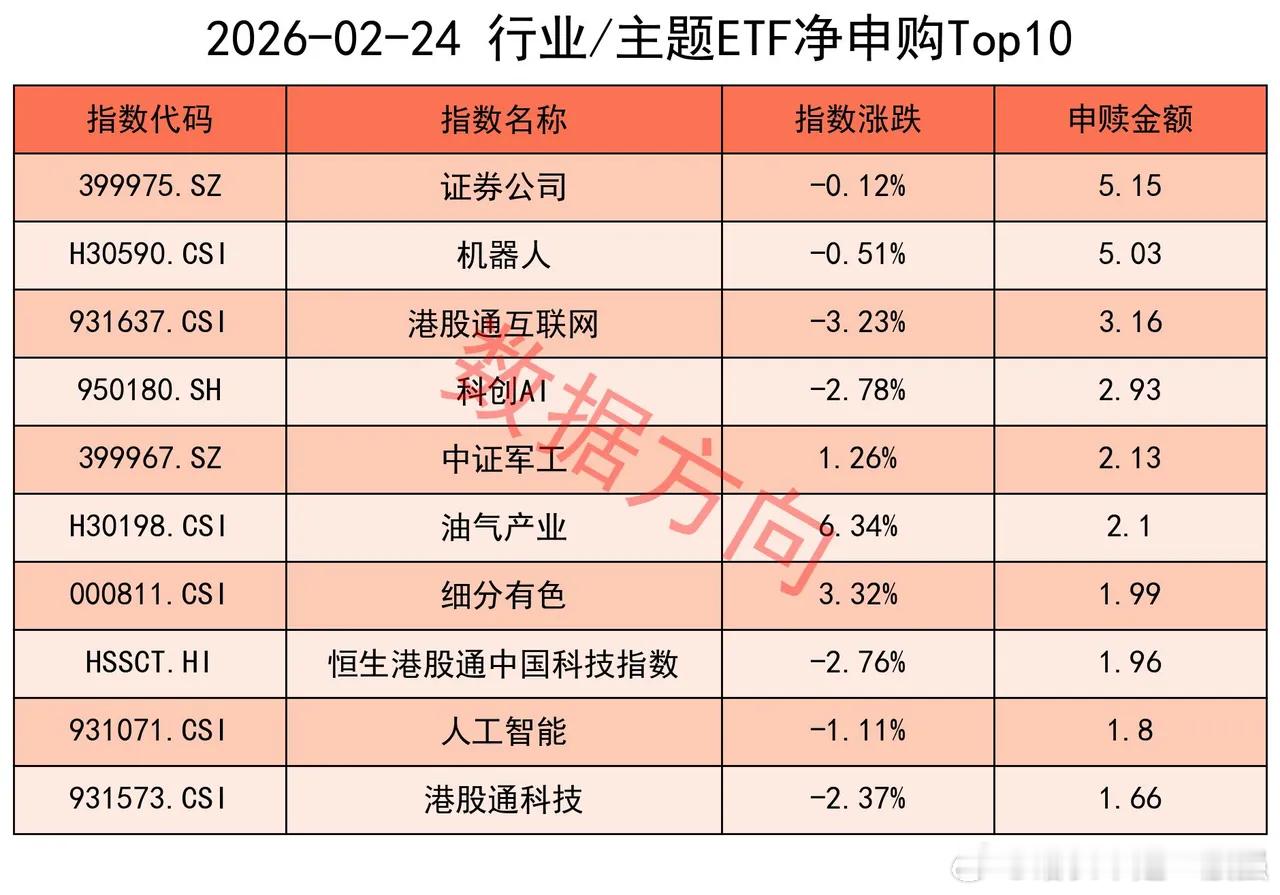 ETF连续6天净赎回2月24日星期二,大盘放量上涨,油气、贵金属涨幅居前,文化传