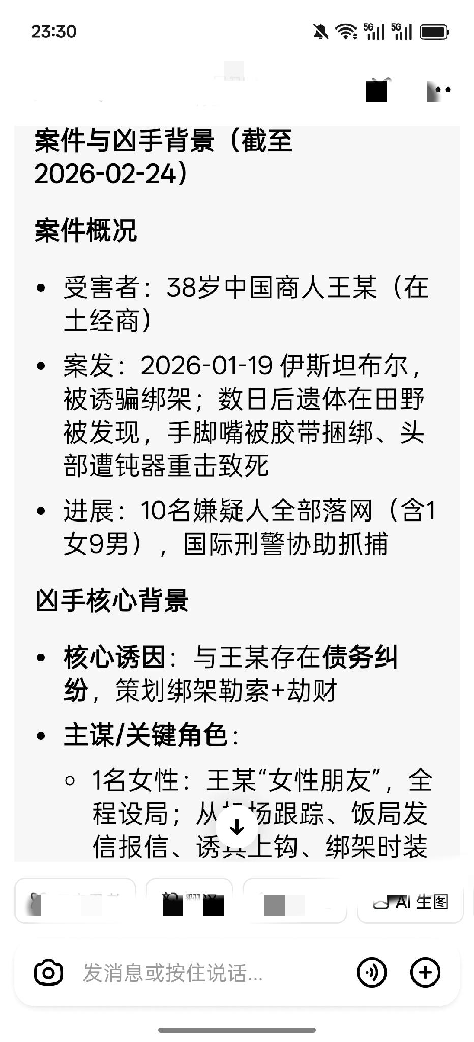 酒是穿肠毒药,色是割骨钢刀 国内商人王某去伊斯坦布尔做生意,一下飞机就去找李女士去餐厅就餐。吃饭期间,宾主二人推杯换盏,气氛极为融洽。只是出门时有些诡异,李女士一个劲的发短信,好像在联系什么人。她又怕王先生发现,只要王先生招呼她,她就赶紧把手机拿在手里。 一出餐厅就来了几个歹徒,把王先生掳走了,先是严刑拷打再刑讯逼供,把王先生手机里的加密货币搞走了不少。然后再把王先生栽进郊区的荒地里,让他做了异乡之鬼。 大伙儿不要以为这是内外勾结做案,警方说这伙人全是国人,据说有什么经济纠纷,所以出此下策。我有个疑问,是经济纠纷,为什么不去法院起诉? 为什么要去土耳其犯案?拿到钱以后为什么要杀人灭口?我怎么看都觉得是以色相诱,伺机抢劫勒索的做派!