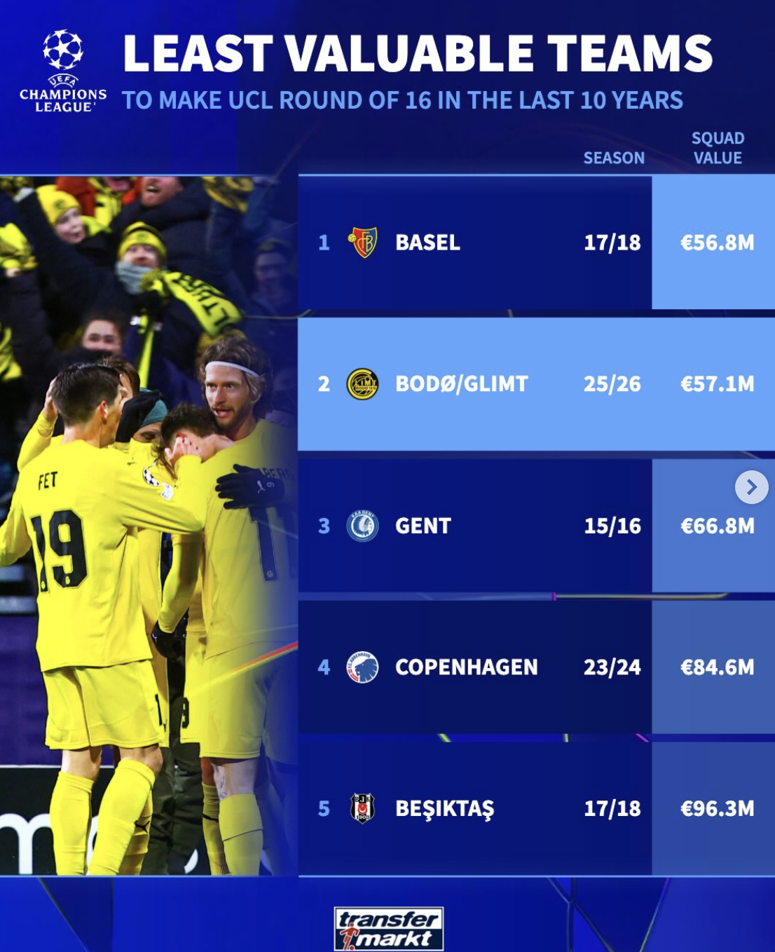 今天凌晨晋级16强的博德闪耀以5710万排名第二,仅次于17/18赛季的巴塞尔的5680万。