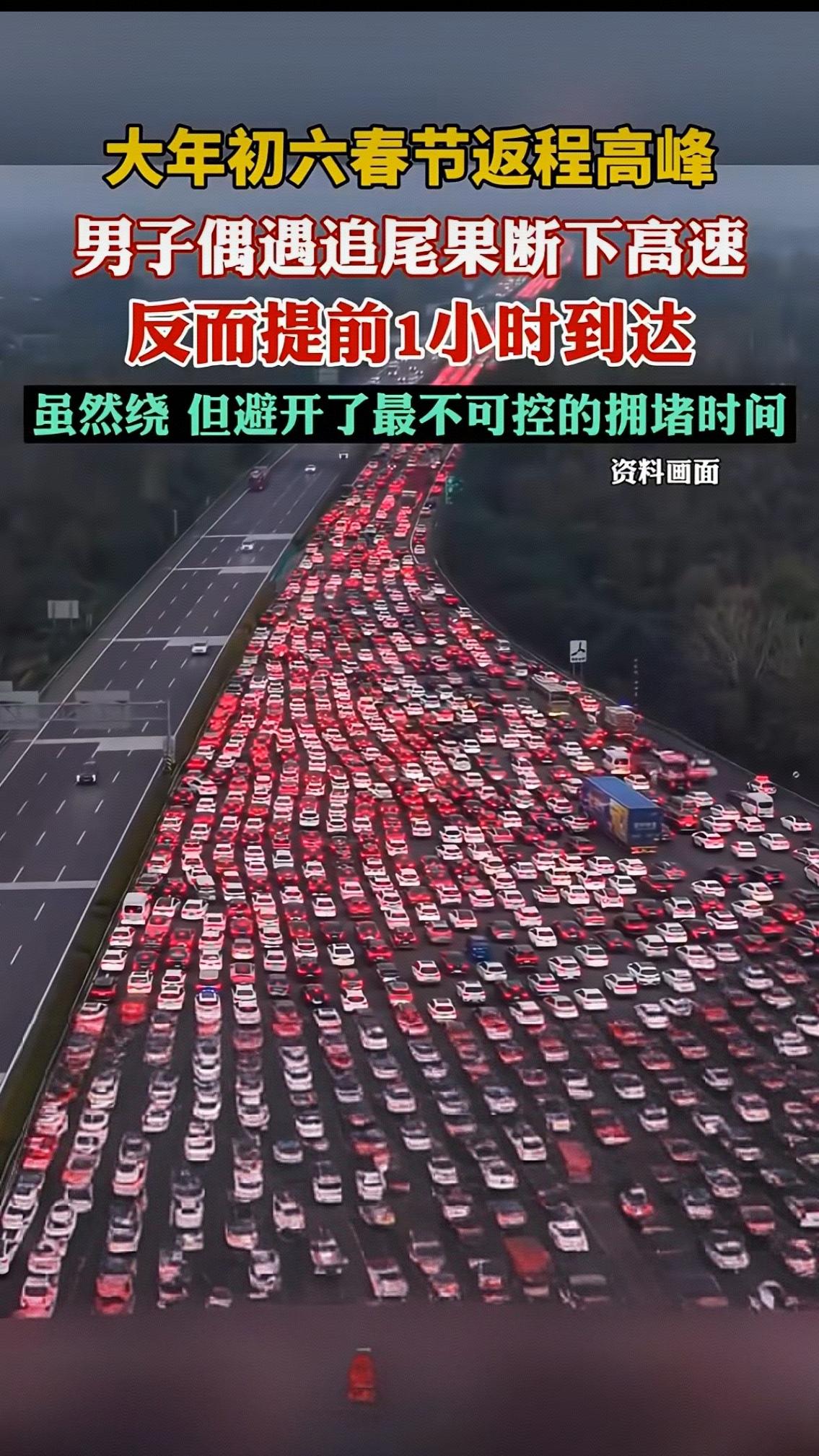 大年初六春节返程高峰,男子偶遇追尾果断下高速,反而提前1小时到达,虽然绕但避开了最不可控的拥堵时间。 这一幕,戳中了无数返程人的心声。初六高速全线飘红,车流量破纪录,一点点剐蹭就能堵出十几公里。大家都抱着“走高速最快”的执念,死磕一条路,结果被事故、缓行、龟速耗光耐心。有人堵到脚麻,有人错过饭点,有人眼睁睁看着时间白白流逝。 而这位男子的清醒,在于不跟拥堵死磕。看到追尾的瞬间,他立刻判断:事故处理少则半小时,多则一小时,后面车流只会越堵越死,与其在原地赌运气,不如主动改道。他就近下高速走国道,路虽远一点,但全程顺畅不停车,没有加塞、没有事故、没有无休止的等待。 看似“绕远”,实则走了捷径。这哪里是开车技巧,分明是生活智慧:别在不可控的事上浪费时间,及时止损、灵活变通,才是最高效的选择。 很多人看完直呼“学到了”:下次返程,绝不死磕高速!你返程堵了多久?有没有过果断绕路反而更快的经历?评论区聊聊!返程避堵攻略 返程高速
