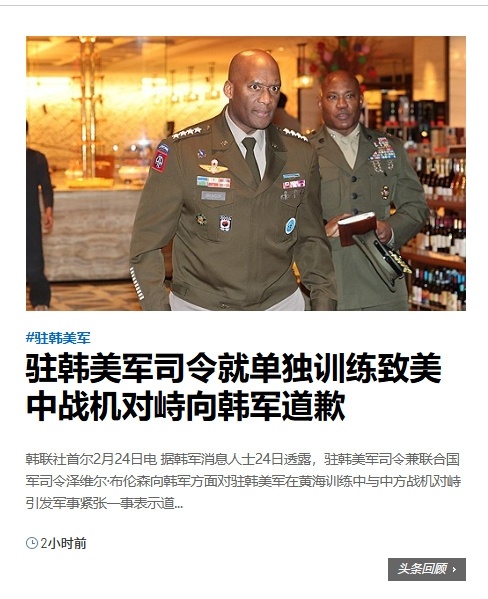中美军机黄海对峙【驻韩美军司令鲁莽行事被迫道歉】 据韩军消息人士24日透露,驻韩美军司令兼联合国军司令泽维尔·布伦森(Xavier T. Brunson)四星上将向韩军方面对驻韩美军在黄海训练中与中方战机对峙引发军事紧张一事表示道歉。