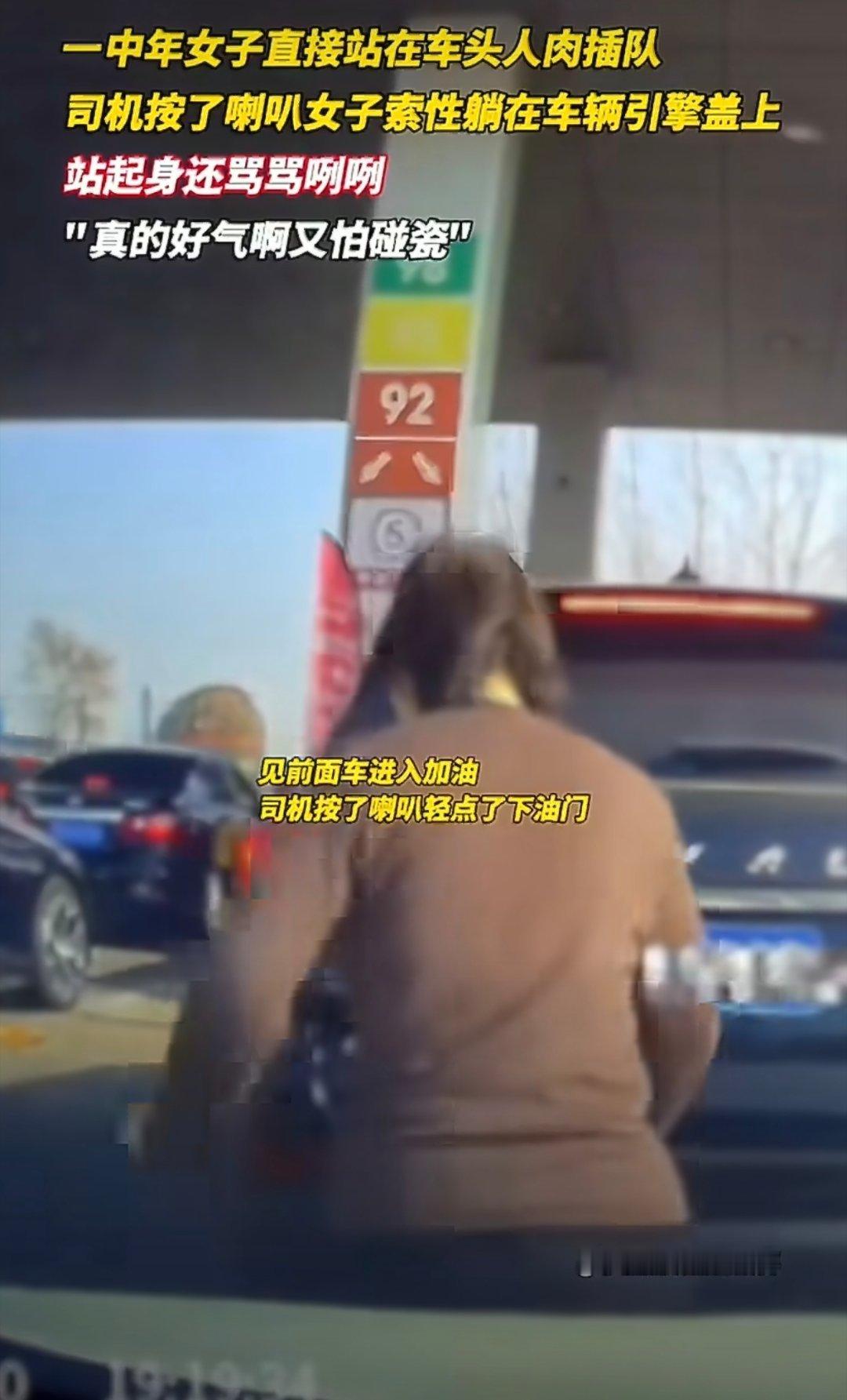 女子在加油站人肉插队躺后车引擎盖真的是什么人都有,插队插成这样,甚至还吼了被插队的车遇到这种,该怎么治?