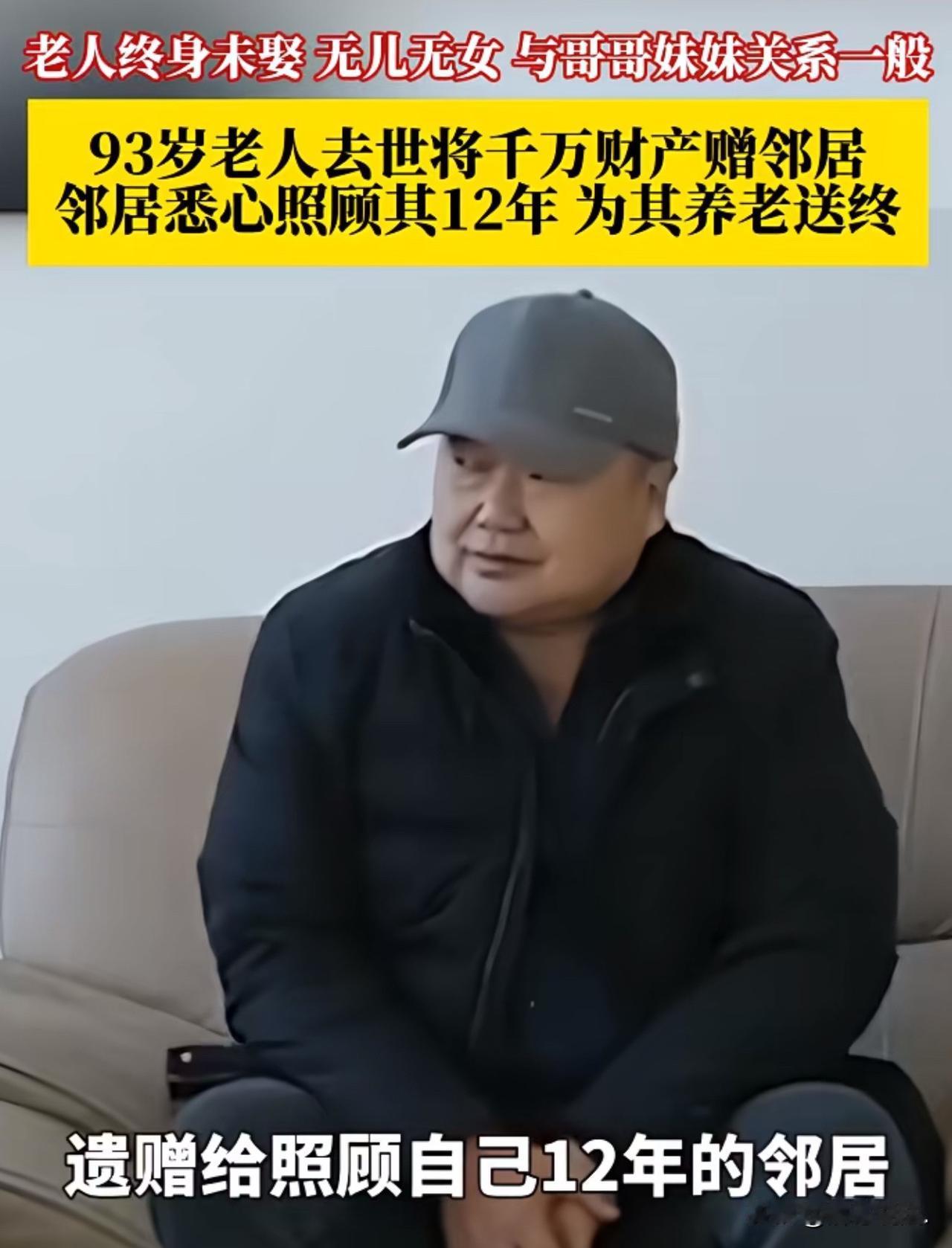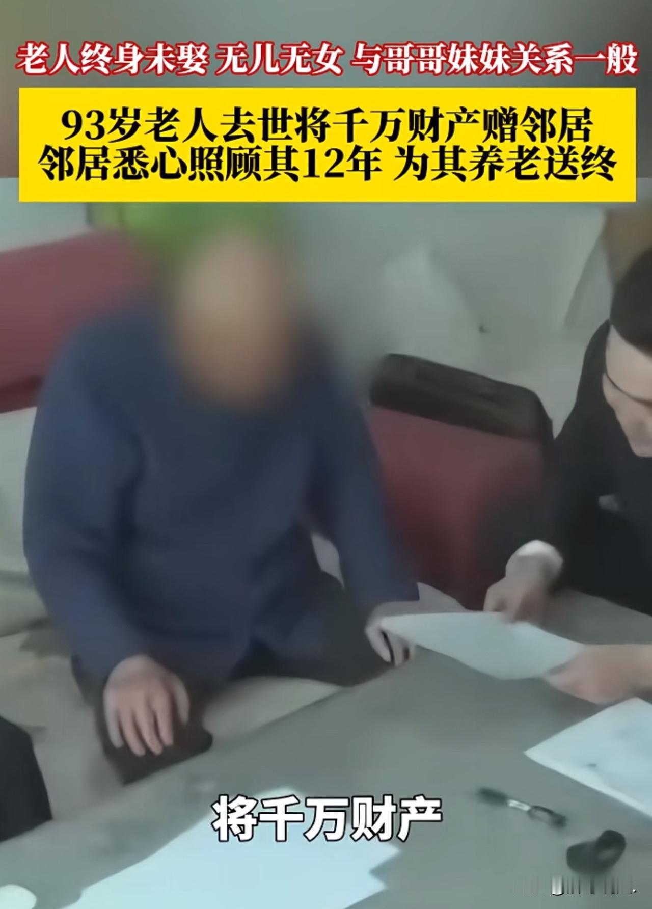 北京,81大爷无儿无女,只有4个哥哥和一个妹妹,平日与他们并无来往,大爷独自生活,晚景凄凉,生活不能自理。邻居男子善良,主动承担起照顾大爷的义务。同时,在村委会的见证下,两人签订了遗赠扶养协议,老人余生由男子照顾,养老送终,老人将名下11间房屋等全部财产,在身后赠与男子。男子履行约定,照顾老人12年,老人离世后,男子又为老人披麻戴孝,送老人最后一程。谁知,葬礼刚刚结束,老人的4个哥哥和一个妹妹蹦了出来,要求继承老人的千万财产。男子拿出遗赠协议,怒怼:老人卧病在床时候你们哪去了,凭什么继承财产?可对方反咬一口,说男子无血缘欢关系,没资格继承遗产,遗赠协议是老人糊涂时候签下的,不作数,双方争执不下,闹到法院,法院的判决大快人心。 2023年9月,93岁的阮大爷走完了自己的一生,同村村民刘某为其安排了葬礼,披麻戴孝送走了他最后一程。 葬礼刚刚结束,阮大爷的四位哥哥和一位妹妹,就找到了刘某,要求继承阮大爷名下的千万财产。 刘某愤怒不已,老人家在病床上你们哪去了,还有脸来分遗产,同时,刘某拿出遗赠扶养协议。 但几人对遗赠扶养协议并不认可,认为刘某和阮大爷毫无血缘关系,一个外人根本没资格继承继承,同时,反咬一口,称协议是阮大爷病入膏肓,糊涂时候,他诱骗阮大爷签下的,根本不作数。 刘某气愤不已,决定走法律程序维权。 事情到底是怎么回事呢? 阮大爷一生没娶妻,无儿无女,身边虽有四个哥哥和一个妹妹,可平日里往来稀疏,亲情淡薄。 晚年的阮大爷独自守着老宅,日子冷清又孤单,身边连个端茶倒水的人都没有。 看着别家儿孙绕膝,他常常坐在门口叹气,心里满是落寞。 还好,平日里,邻居刘某一家心地善良,会经常关照阮大爷,让阮大爷的生活有一丝慰藉。 2011年,阮大爷身体越来越差,生活渐渐难以自理。 4个弟弟一个妹妹,依旧很少露面,更谈不上照料。 无奈之下,村委会出面协调,希望能有人为老人养老送终。 刘某和阮大爷邻里之间这么多年,有了感情,他看着老人孤苦无依,动了恻隐之心,愿意扛起这份责任。 在村委会的见证下,两人郑重签订了遗赠扶养协议:刘某负责老人的饮食起居、生病照料,直至送终安葬;老人则将名下11间房屋等全部财产,在身后赠与刘某。 签下协议的那一刻,阮大爷眼眶泛红,终于有了安稳的依靠。 此后十二年,刘某说到做到,把老人当成亲人对待。天冷添衣、生病送医、三餐照料、日常陪伴,事无巨细、尽心尽力。 老人行动不便,刘某就搀扶着散步;老人夜里不舒服,刘某随叫随起。村里人都看在眼里,都说阮大爷遇上了好心人。 平静的日子在2017年被打破,村庄整体拆迁。 阮大爷的老宅换来380多万元补偿款与5套安置房,身家一下子跃近千万。 这笔天降的巨额财富,让原本疏远的亲属们重新“活跃”起来,有人旁敲侧击打听财产,也有人暗中盘算,矛盾悄然埋下。 阮大爷心里清楚,真正守在身边的只有刘某。 2023年3月,头脑清醒的他再次签订遗赠扶养协议,再次明确:由刘某履行生养死葬义务,自己名下包括5套安置房在内的全部财产,均归刘某所有。 这份协议,是老人对十二年真情的笃定回应。 同年9月,阮大爷安详离世。 刘某按照习俗,体面地为老人操办后事、送终入土。 可就在他料理完丧事,准备按协议继承财产时,阮大爷的部分近亲属跳了出来,以“未参与协议签订”“血缘更近”为由,对遗产归属提出异议,双方争执不下,出现了文章开头那一幕。 刘某将一气之下,诉至法院,请求确认遗赠扶养协议的法律效力。 法庭上,双方各执一词:亲属强调法定继承身份,刘某则以十二年照料与两份合法协议为据。 法院经过实地走访、村民证言与村委会核实,查明事实:刘某十二年间悉心赡养,让阮大爷安享晚年,完全履行了协议义务;两份遗赠扶养协议,均是老人真实意愿,合法有效。 依据《民法典》第1158条,自然人可以与法定继承人以外的个人签订遗赠扶养协议,扶养人承担生养死葬义务,享有受遗赠权利;且遗赠扶养协议效力优先于法定继承。 最终,法院依法作出判决:阮大爷名下5套安置房的全部权益,由刘某继承。 一纸判决,还了公道,也暖了人心。 十二年的陪伴与照料,胜过淡薄的血缘;法律的公正,守护了善良与承诺。 这场亲情与情义的较量,最终给出了最温暖的答案。 欢迎关注@解豸说法.