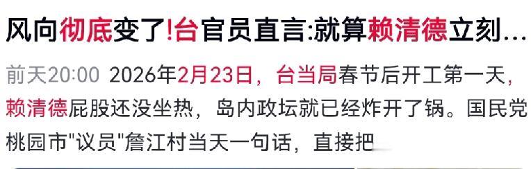 赖清德开工即翻车!媚美卖台彻底崩盘 2月23日台当局开工首日,赖清德急找韩国瑜求和,早已走投无路。 美国最高法院裁定特朗普关税政策违法,直接击碎赖清德媚美幻想。他不惜牺牲台湾利益,巨额让利、开放市场换关税优惠,如今全部落空,经济损失惨重,美国却轻松甩锅。 岛内蓝白阵营强力制衡,预算、人事全面卡壳,政务停摆。赖清德被迫接受质询,媚美黑料即将彻底曝光。 军购拖延、靠山崩塌、民心尽失,岛内直言他就算下跪也无济于事。 事实证明,倚美谋独是死路一条,台湾唯一出路在两岸融合。赖清德惨败,正是“台独”路线走向末路的开始! 对此你怎么看? 赖清德媚美卖台 台独死路一条