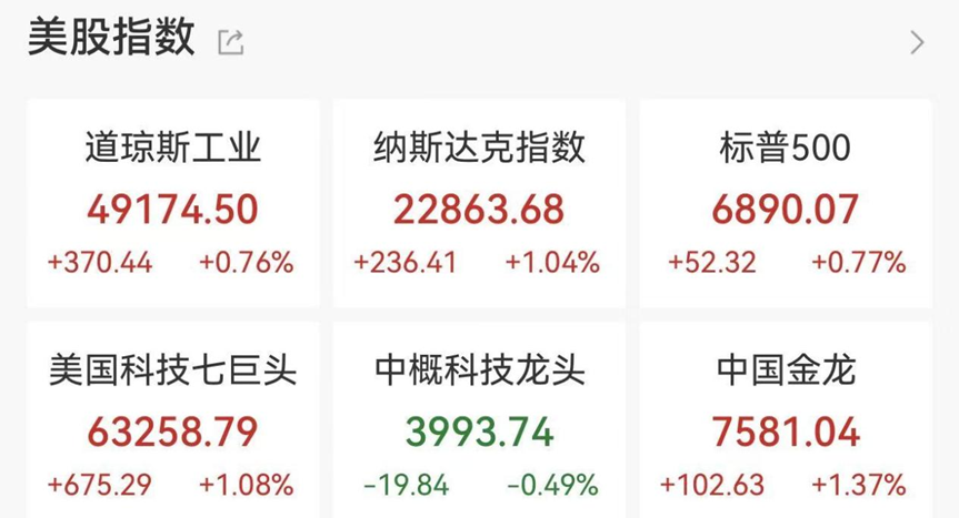 隔夜,美股三大指数集体收涨。截至收盘,标普500指数涨0.77%,纳斯达克综合指数涨1.04%,道琼斯工业平均指数涨0.76%。