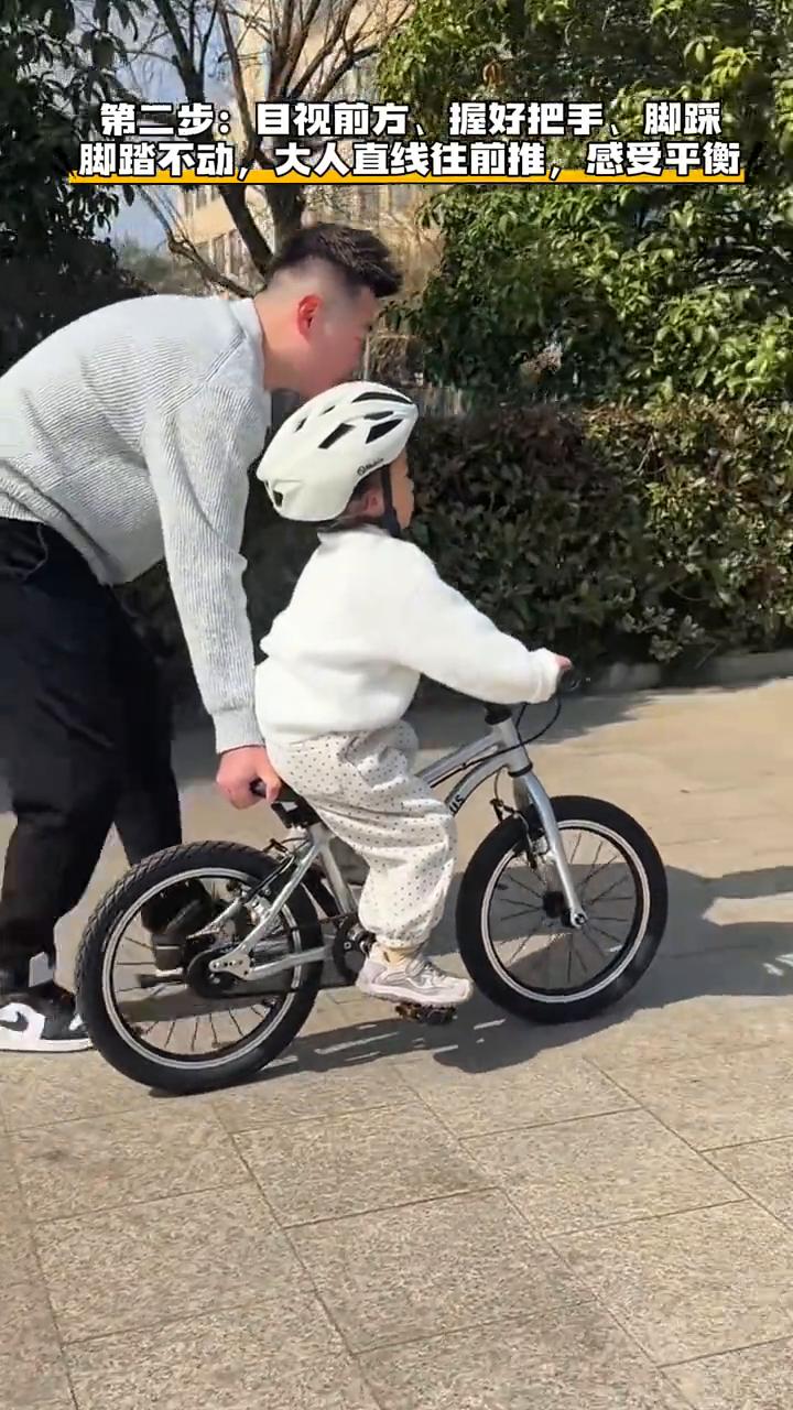 让孩子学会蹬脚踏。 爸爸教三岁女儿学自行车,这方法几分钟就学会了。 ·第一步:抬起后轮,用力蹬,加速,停。 ·第二步:目视前方、握好把手、脚踩。脚踏不动,大人直线往前推,感受平衡。不要踩,方向掌握好。 ·第三步:开始踩脚踏,车子平稳后,大人慢慢放手。用力踩。 成长是一场渐行渐远的分离,别回头、别停留、往前走,父母会站在你身后努力陪伴你成长中的每一个重要时刻。愿你成为自己的太阳,光芒万丈。愿你在成长的道路上一路坦途,前程似锦。