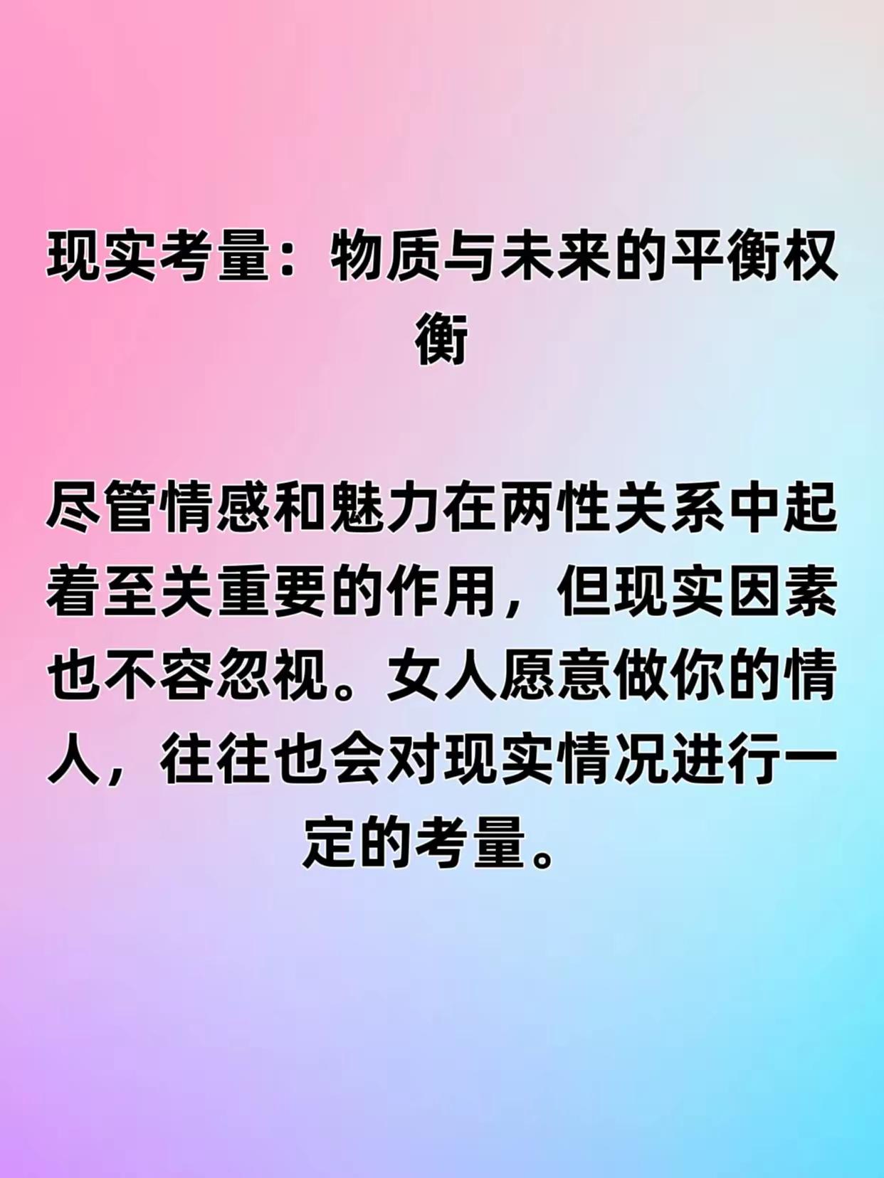 两性关系:女人愿意做你情人的三个条件,你符合几个? 关于“两性关系”中“女人愿意做你情人的三个条件”,可以从心理和情感层面总结出几个比较普遍的因素,供你参考: 真诚和尊重 女人愿意成为情人,首先希望得到真诚的对待和尊重。她们希望对方能够尊重她的感受,不玩弄感情,也不会轻易伤害她。 情感连接和安全感 即使是非正式的关系,情感上的连接和安全感依然重要。她们希望在你这里找到情感的慰藉,感觉被理解和支持。 实际利益和生活便利 这包括物质上的支持、生活上的帮助,或者对方的成熟和能力能给她带来一定的安全感和便利。 你觉得自己符合几个呢?如果你愿意,我可以帮你分析一下你的情况,或者给你一些提升两性关系的建议。