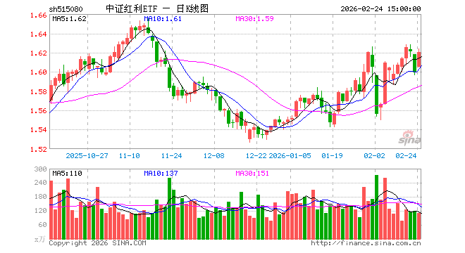 2月24日,中证红利ETF(515080)涨1.31%,成交额1.81亿元。当日份额减少2000.00万份,最新份额为49.55亿份,近20个交易日份额减少4.24亿份。最新资产净值计算值为80.34亿元。