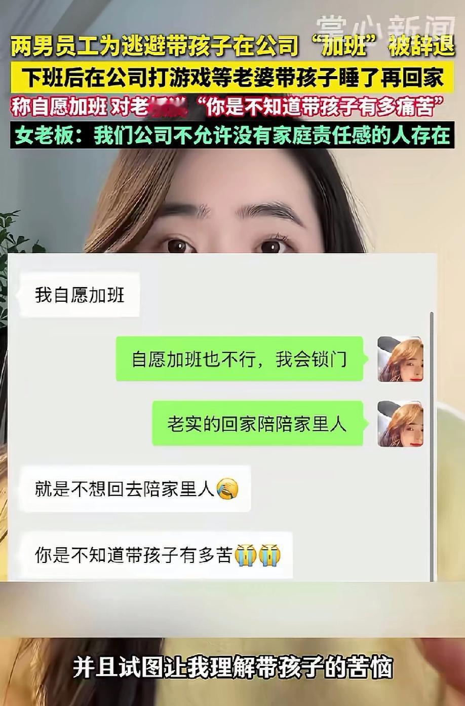 这才是霸道女总裁该有的样子!女老板发现,公司两个男员工经常加班到很晚才回家,公司业务并不多,她也不主张员工辛苦加班,让他们早点下班回家。没想到,两个男子竟然称他们是自愿加班,之所以不回家,是觉得回家带孩子太痛苦,这才以“加班”的名义躲在公司打游戏,等老婆孩子睡着了再回家。本以为女老板会理解他们不想带孩子的苦恼,却不料,女老板直接将他们辞退:公司不允许没有家庭责任感的人存在。 女老板张姐最近接连辞退了两名男员工,这事在公司里引起了不小的震动,而辞退的原因,说出来让不少人觉得解气又感慨。 张姐的公司是2025年8月份才成立的,规模不大,业务量也很少,到目前为止总共就成交了三单。 平时大家的工作都很轻松,张姐也从来不提倡员工加班,还经常提醒大家到点就下班,多陪陪家人。 可最近她却发现,公司里的男员工小王,每天都要待到很晚才走,还主动跟张姐发消息说自己在加班。 张姐心里一直犯嘀咕,公司压根没多少活,根本不存在需要加班的情况,这加班加得实在太蹊跷了。 于是她直接找小王对质,一句话就戳破了谎言:公司成立到现在才三单业务,哪来的班让你加? 被问得哑口无言的小王,这才磨磨蹭蹭说出了实情。 原来,小王根本不是在加班,就是不想回家带孩子,故意躲在公司里打游戏,打算等老婆把孩子哄睡着了再回家,这样自己就能轻松自在,不用操心带娃的事。 小王甚至还理直气壮地劝张姐理解,说等你有孩子你就知道带孩子有多痛苦了,丝毫没觉得自己的做法有问题。 这话让张姐又气又无语,她实在想不通,小王到底想让自己同情什么?带孩子本就是父母双方的责任,怎么就成了让男人避之不及的麻烦? 更何况还打着加班的幌子,在公司混时间,这种没有家庭责任感的行为,她绝对不能容忍。 于是张姐当场决定,直接辞退小王。 没想到被辞退的小王,非但不反思自己的问题,反而倒打一耙,说张姐是无故辞退员工,想以此耍赖。 张姐听了直接回怼:这叫无故辞退吗?丧偶式育儿都丧到我公司来了,你要是觉得不服气,顺手给我报个警都行。 其实这已经不是张姐第一次辞退这样的员工了,就在上个月,公司里另一个男员工小李,也是因为同样的原因被她开除。 小李每天下班也赖在公司不走,明目张胆地跟同事说,自己就是要在公司打游戏,等到老婆把孩子哄睡了再回家,这样就不用带孩子,能图个清净。 张姐得知后没有丝毫犹豫,立刻辞退了小李,并且还当着公司所有员工的面明确表态:我们公司绝对不允许没有家庭责任感的人存在,连自己的家庭、自己的孩子都不愿意负责的人,更不可能对工作上心。 接连辞退两名逃避带娃的男员工,张姐心里也满是感慨。 她也终于明白,为什么社会上总是只问女性该如何平衡家庭和工作,却很少有人问男性这个问题。 那是因为很多男性从心底里就把家庭责任直接“外包”给了妻子,连面对这个问题的勇气都没有,更别说承担起带娃、顾家的义务了。 在张姐看来,工作可以不忙,能力可以不强,但最基本的家庭责任感不能丢,躲在公司用假加班逃避带娃,既耽误了公司的风气,更是对家庭、对孩子的不负责任,这样的员工,她的公司绝对不留。 《劳动合同法》第三十九条规定:劳动者有下列情形之一的,用人单位可以解除劳动合同:(二)严重违反用人单位的规章制度的。 小王、小李以“加班”为名在公司打游戏、逃避带娃,属于虚构加班、占用公司资源、违反劳动纪律的行为。 若公司有明确制度,如禁止工作或加班时间娱乐、禁止虚假加班,且制度经民主程序制定并公示,该行为可认定为严重违纪。 这种情形下,张姐辞退二人,符合法定过错性解除条件,无需支付经济补偿。 《劳动合同法》第三十九条规定:劳动者有下列情形之一的,用人单位可以解除劳动合同:(三)严重失职,营私舞弊,给用人单位造成重大损害的。 小王、小李两人长期虚假加班、占用办公场地与电力、破坏公司风气、误导考勤管理,属于失职和舞弊行为。 虽然未造成直接经济损失,但长期、反复、公开的虚假加班,已构成对公司管理秩序的“重大损害”。 张姐以“无家庭责任感、对工作不上心”为由辞退,也可归入此条:对工作敷衍、侵占公司利益,构成法定解除理由。