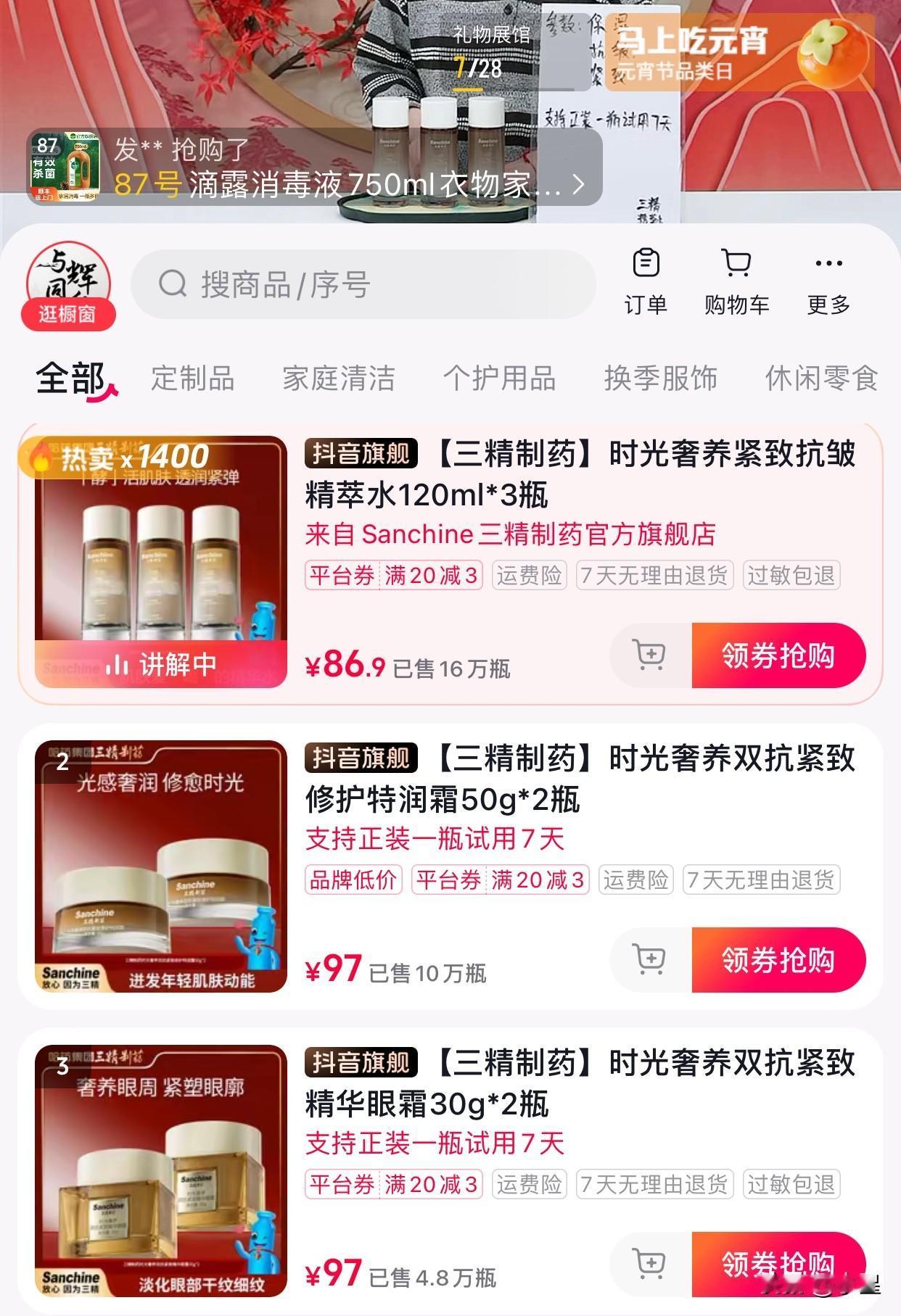 与辉同行年后复工第二天 一大早9万人涌进了直播间 直奔三精的产品而来 自从去年9月份黑龙江行 三精的产品卖爆后 有几个月的时间一直供不应求 尤其是精粹水直接卖断货 已经有挺长时间没上架了 今天可算是千呼万唤始出来 正好上一次买的快用完了可以补货 这三精的产品是真耐用啊 整整三大瓶,能用大半年 第一次在化妆品里用出了量贩的感觉[笑哭] 有谁还记得去年三精产品 在与辉同行直播间卖爆的盛况 单日销售额破7000万+ 全月破亿,并跻身化妆品TOP7 直接带火了整个品牌 国庆期间很多媒体报道了这件事 三精在与辉同行直播间一战出圈 之后慕名而来的消费者太多 产品直接卖断货 今天好不容易上架 估计又有新的销售破圈记录了 厂家跟与辉同行合作 只要产品好,完全不愁卖 而消费者在这里购物也会更放心 “从你家到我家,必须经过宇辉家”[耶]