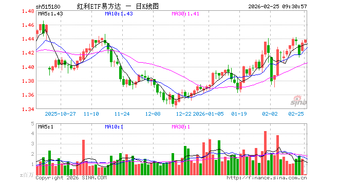 2月25日,红利ETF易方达(515180)开盘涨0.00%,报1.434元。红利ETF易方达(515180)重仓股方面,中远海控开盘涨0.07%,广汇能源涨0.35%,中谷物流涨0.00%,山煤国际跌0.17%,平煤股份跌0.45%,潞安环能跌0.70%,鄂尔多斯跌1.19%,山西焦煤涨0.00%,陕西煤业涨0.09%,藏格矿业涨0.45%。