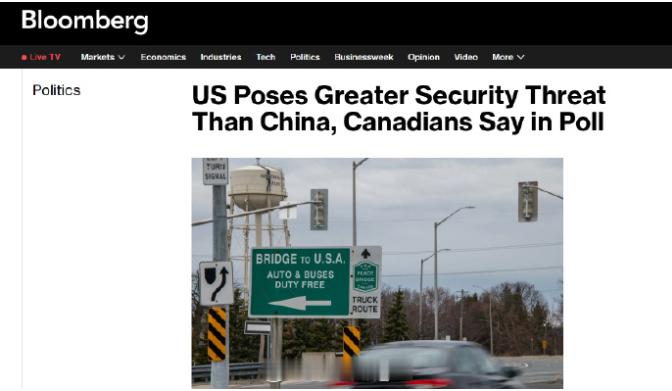 就在前几天,彭博社放出了一份民调数据,55%的加拿大人现在认为,美国才是对加拿大安全威胁最大的国家。要知道,加拿大和美国共享着世界上最长的不设防边境线,两国做了两百多年的邻居,现在居然有过半数的人把"老大哥"当成了最大威胁。