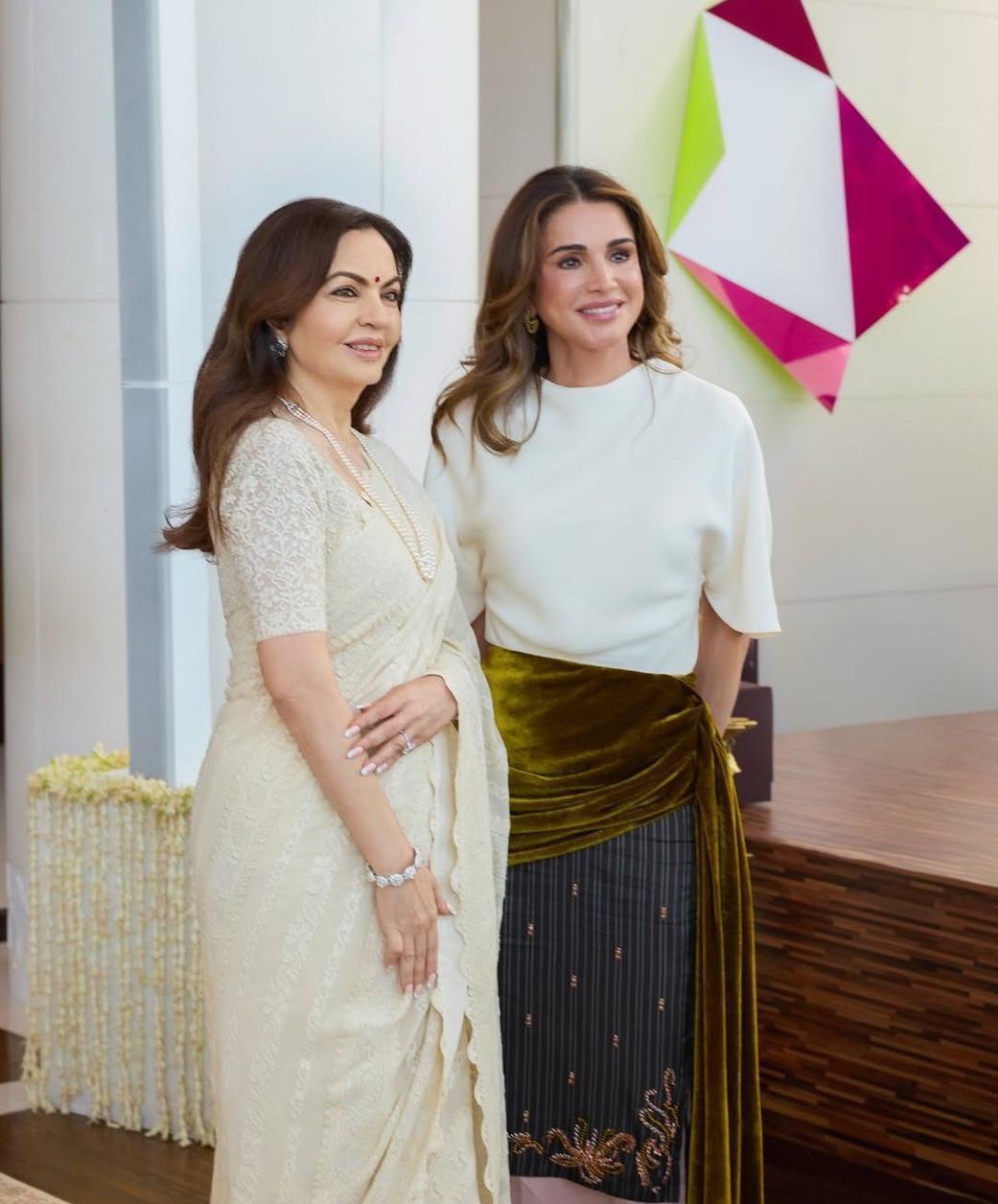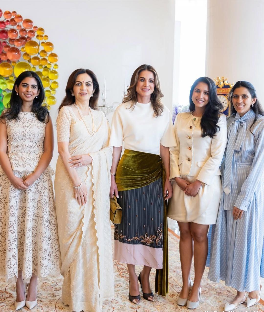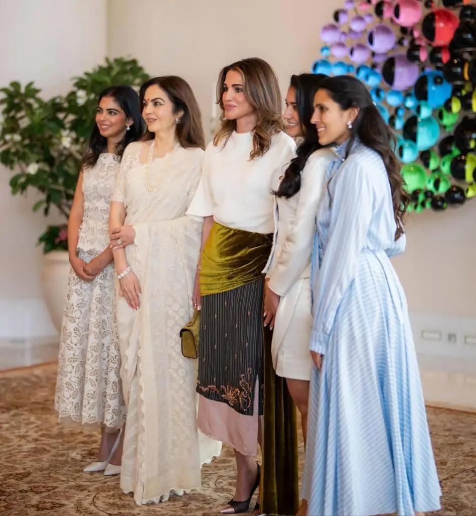 约旦王后拉尼娅到访印度[奸笑] 不仅在新德里演讲,还与印度首富会面, 首富夫人妮塔携家中女眷热情接待了拉尼娅, 妮塔和女儿穿着白色纱丽和裙装,优雅大方, 但两位儿媳似乎略失得体,尤其是小儿媳, 明显去年在婚礼上的传统服饰更适合她[奸笑]