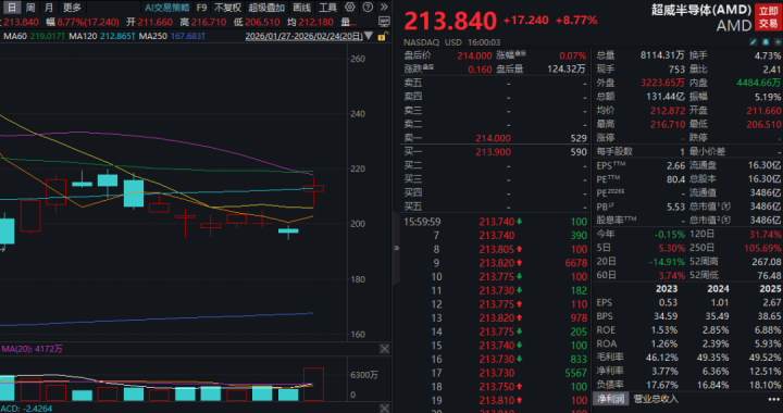 当地时间周二(2月24日),美国三大股指全线收涨。AMD(超威半导体)当天大涨逾8%,成为美股市场焦点之一。消息面上,AMD和Meta宣布扩大战略合作伙伴关系。