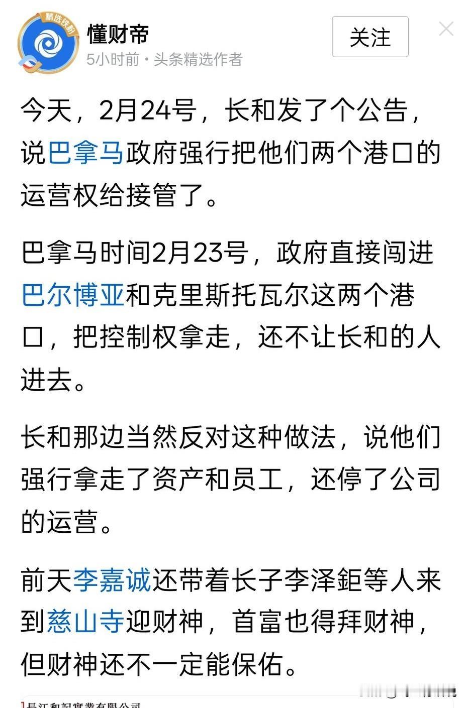 现在说什么也没有用了,李嘉诚运营的巴拿马运河港口彻底被人家收回,再也没有一点余地了 如今往后,李嘉诚除了通过诉讼,拿回一些自己的损失之外,一点都没有余地了 之前,李嘉诚运营港口,大公报发现将港口让国企运营更好一些 特别是李嘉诚准备转让港口的时候,连发声讨,没有看清港口的业主是巴拿马,让港口转让发生了变故,结果成了如今的尴尬 现在,一切皆成死局,彻底无解,大概都傻眼了