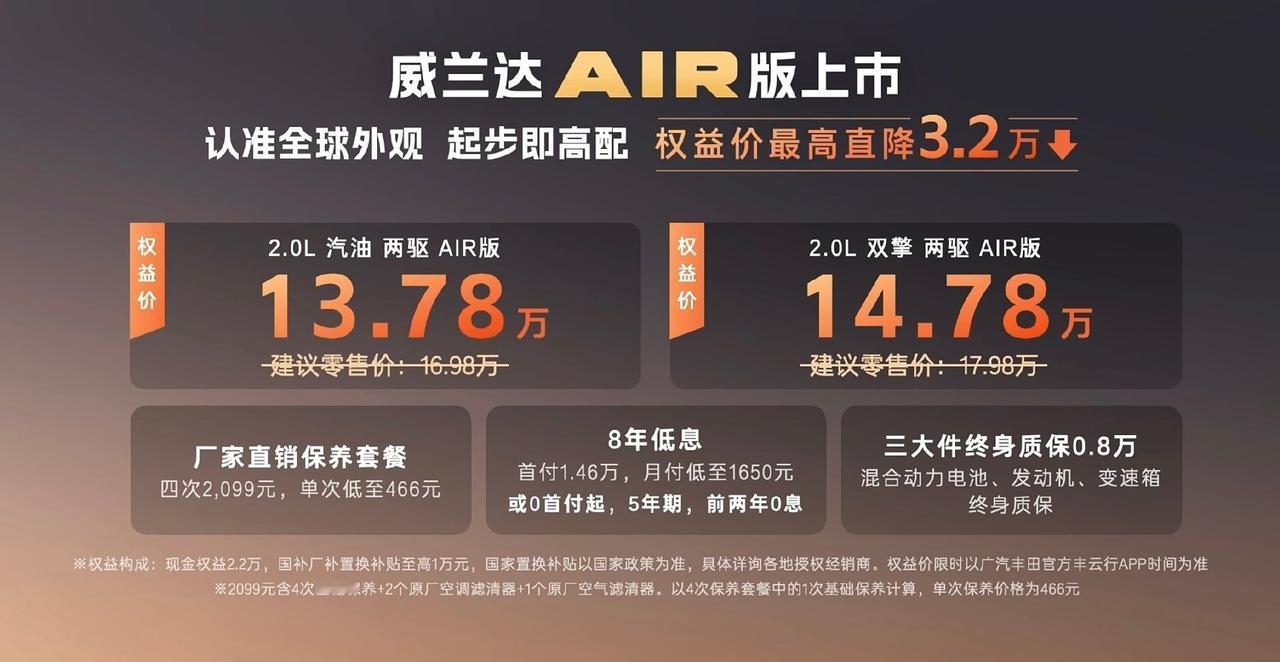 不管你信不信,2026年预计会有几件大事要发生。 1、退休金很少再出现有人拿一万多,有人明明也交了灵活就业却只能拿一千多,随着政策偏向低收入群差距会越来越小! 2、人工智能在医疗领域会有大突破,能帮医生更准地诊断疾病。 3、未来机器人养老可能会代替人工照顾。 4、未来新能源汽车会越来越智能化,汽车市场竞争会越来越激烈。 以广汽本田为首的合资车企为例,打响了开年的第一枪,全新推出了威兰达AIR版。 2月24日,广汽丰田威兰达AIR版正式上市,入门版2.0L汽油AIR版最终权益价为13.78万元,2.0L混动AIR版为14.78万元。 在内饰方面,全新威兰达同样走的是硬派路线,它采用的是三幅式的硬派方向盘,有悬浮式的仪表和悬浮大屏,整个中控台采用较为硬气的面板装饰,表现很干练。 在动力方面,新车的燃油版车型搭载的2.0L发动机最大输出功率为171马力;双擎版的2.0L发动机最大输出功率为152马力。 全新换代威兰达AIR版的推出,不止是带来一个新的选择,更体现了一种以用户为中心的新消费主张。