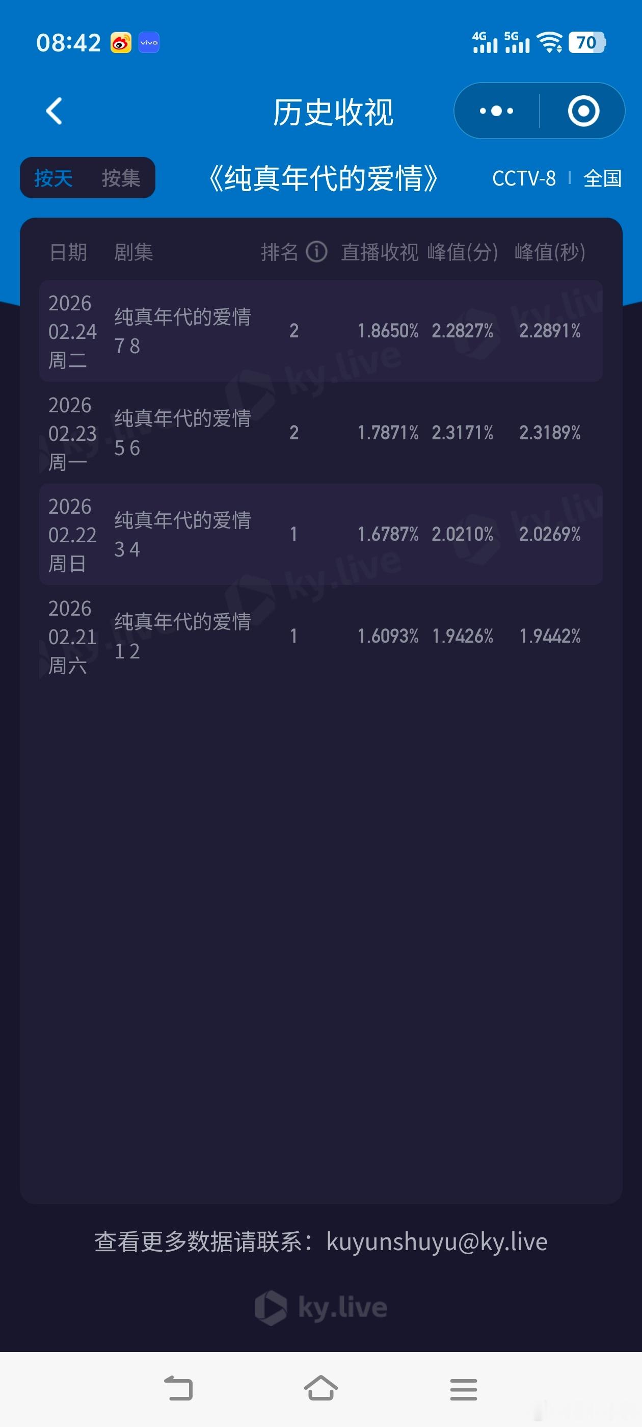 纯真年代的爱情陈飞宇 孙千 《纯真年代的爱情》开播四天收视节节高升!双集走势越来越好了!第二集峰值即将超过第一集峰值!昨日双集酷云走势第一集:起点1.0452,峰值2.2891,平均1.7972第二集:起点1.6168,峰值2.2591,平均1.9340双集平均:1.8650CVB估值:1.8650×0.912=1.701